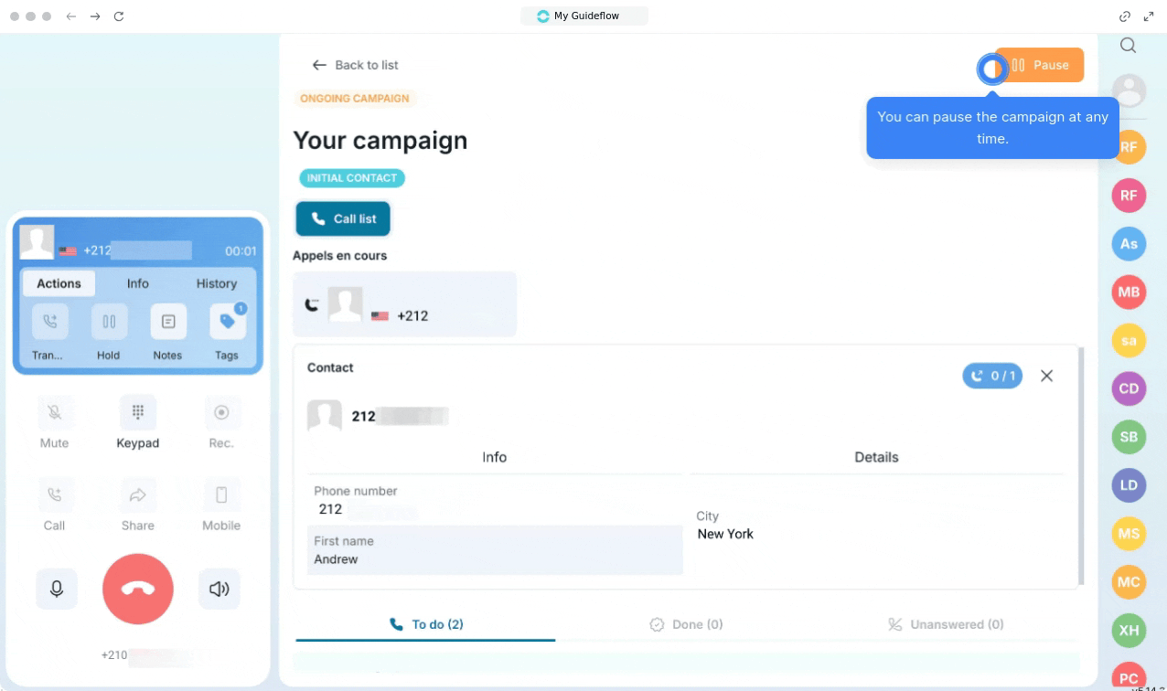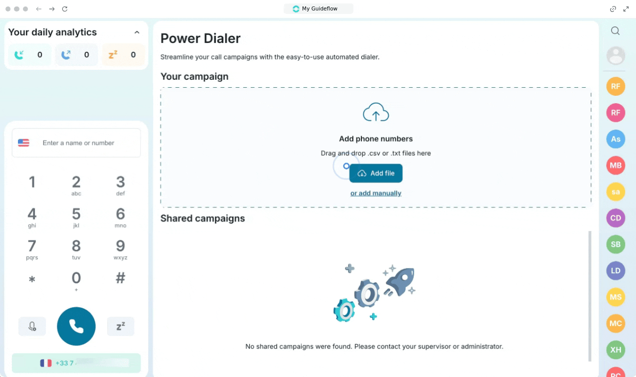You can launch a calling campaign with the Power Dialer. After importing your numbers, you can customize your campaign by: