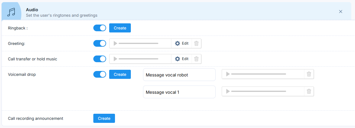 Each Ringover user possesses at least one phone number associated with their account. As with IVRs, you have the possibility of personalising hold music🎵 or pre-answer announcements for each account.