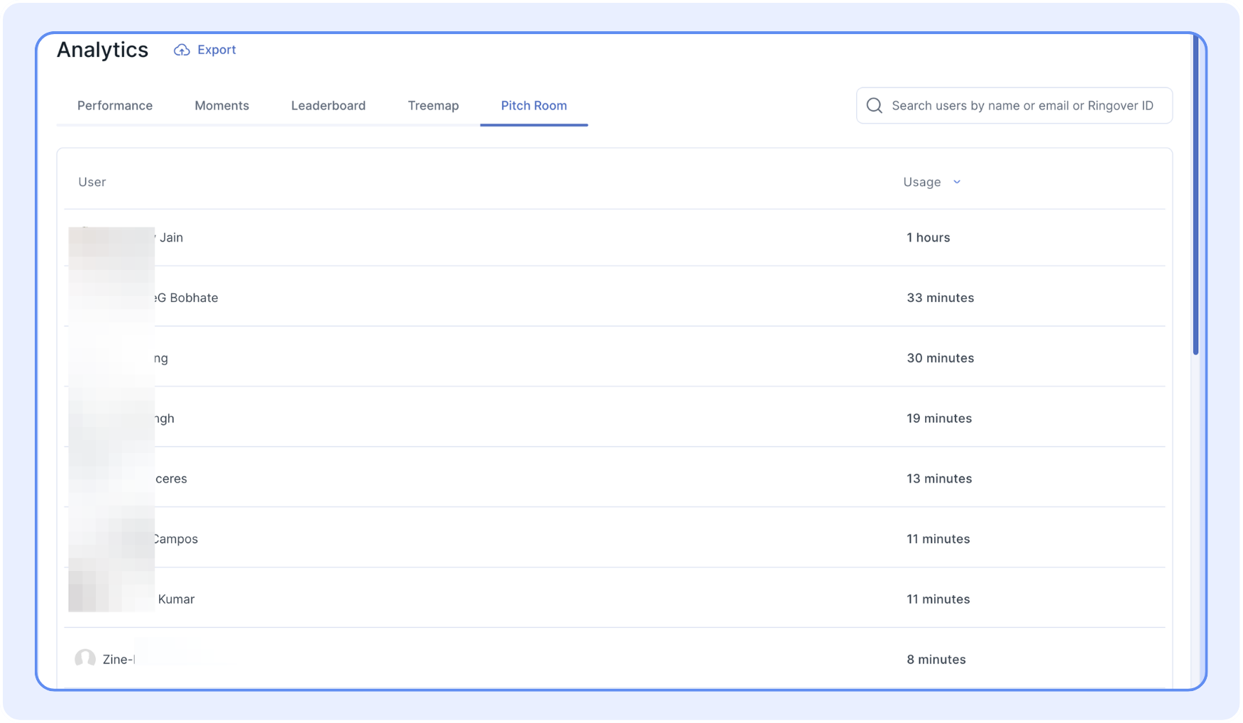 In the pitch room section, you can visualize the users and their usage time.