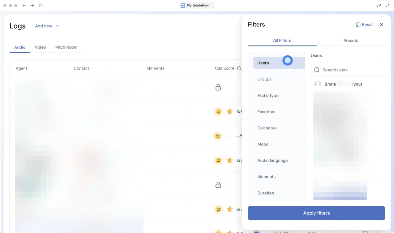 Filters in Empower help you quickly find and organize your logs, making it easier to manage your audios, videos, and Pitch Room activities. By applying the right filters, you can focus on the data that matters most and gain actionable insights from your calls and recordings.