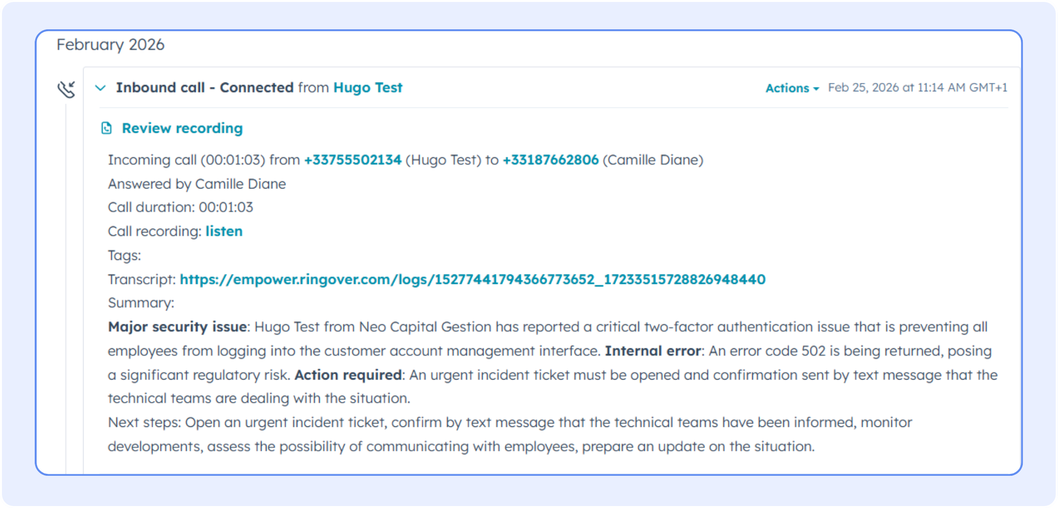 - Recordings must be enabled in Ringover