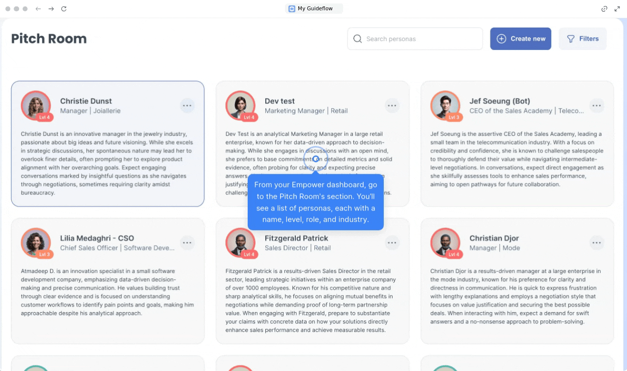 From your empower dashboard, click on the Pitch Room icon. The screen displays a list of available personas. Each persona listing shows the persona's name, level, role, and industry.