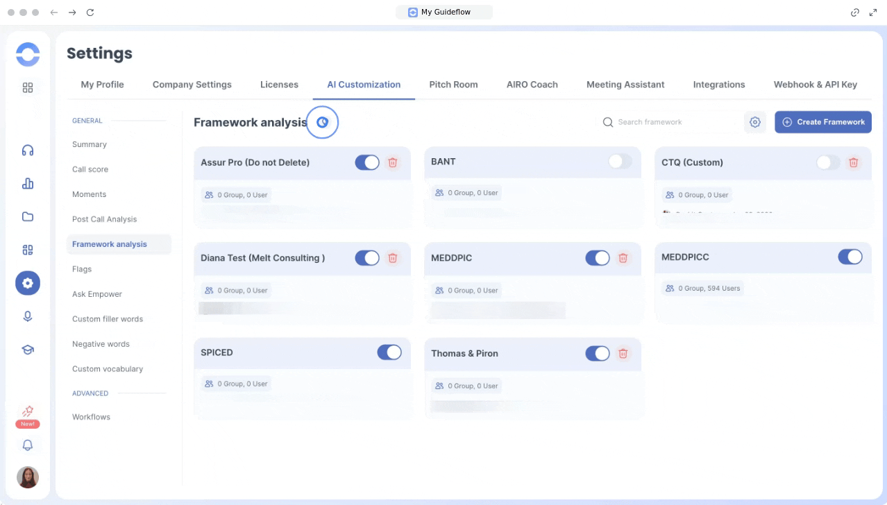 The "Framework Analysis" feature allows you to customize how the AI analyzes calls according to your team’s sales or performance methodologies, such as MEDDPICC, BANT, SPICED, or your own custom frameworks.