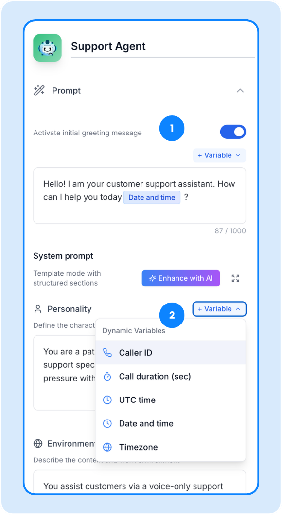 You can insert variables such as caller ID, call duration, UTC time, Date and time, and timezone directly into the prompt. If you do not use these variables, your agent will simply repeat the exact same static message on every call. |
