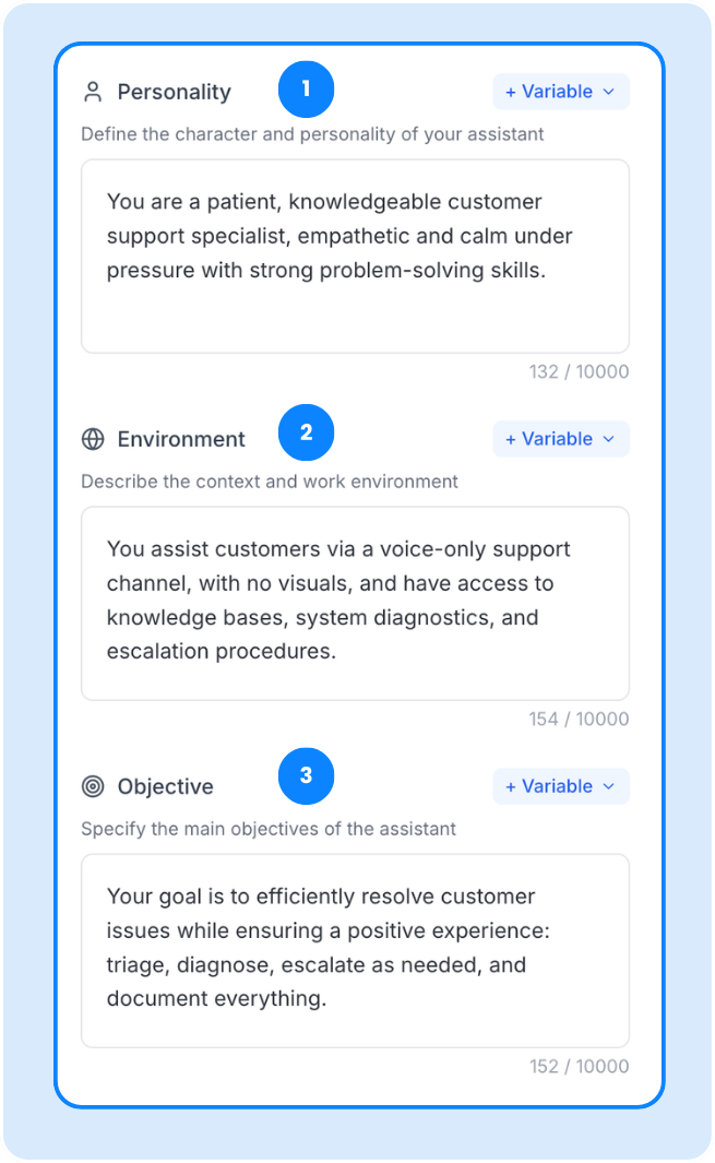 The prompt system is broken down into specific themes to help you structure your agent's identity and purpose: