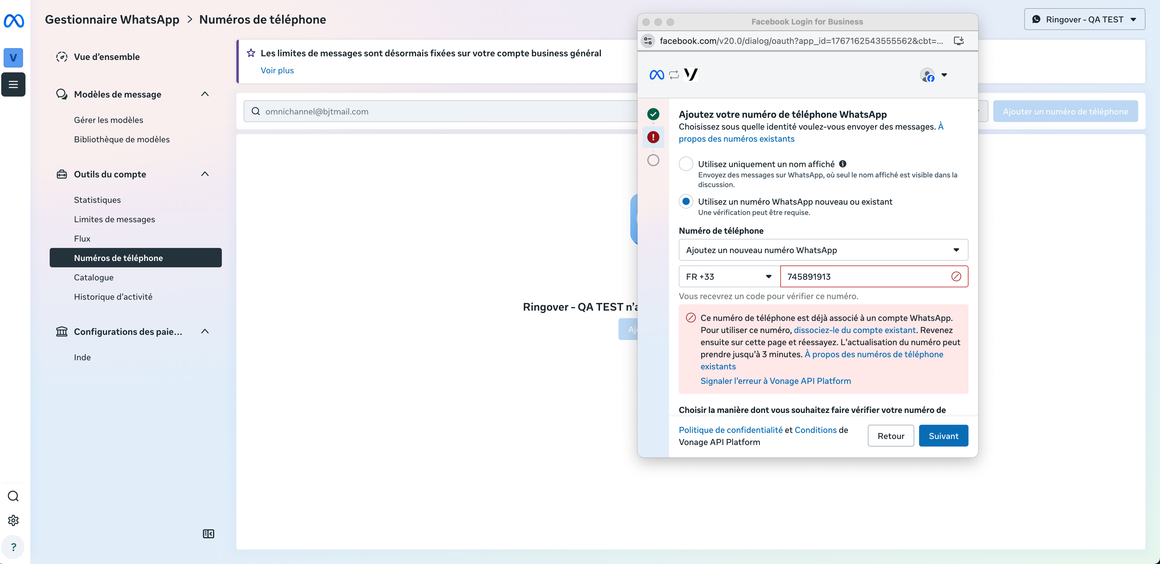 ⚠️ If the number is already associated to a WABA, this message will appear :