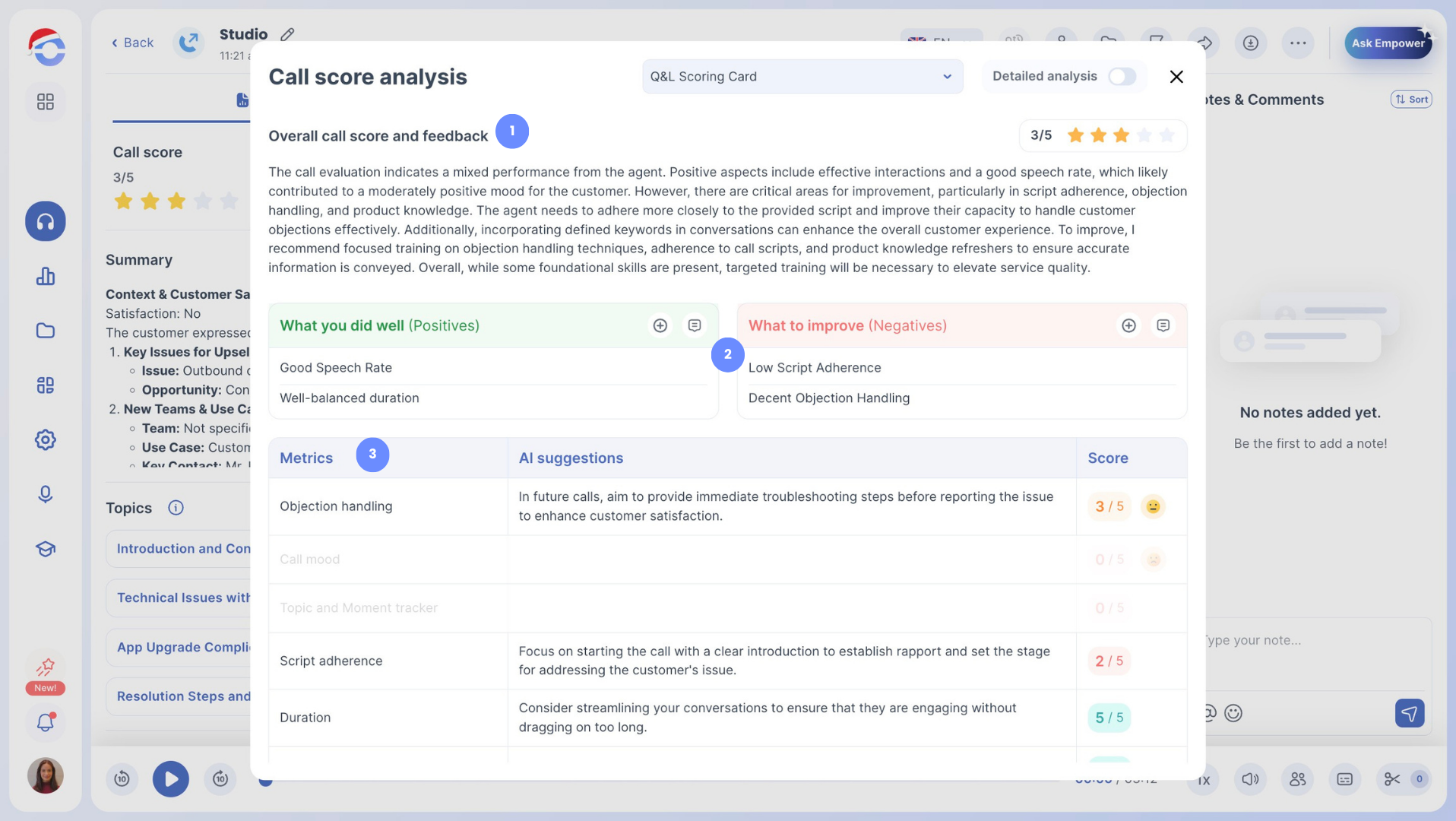 - Strengths and areas for improvement, highlighting what the agent did well and the improvement areas, accompanied by specific suggestions.