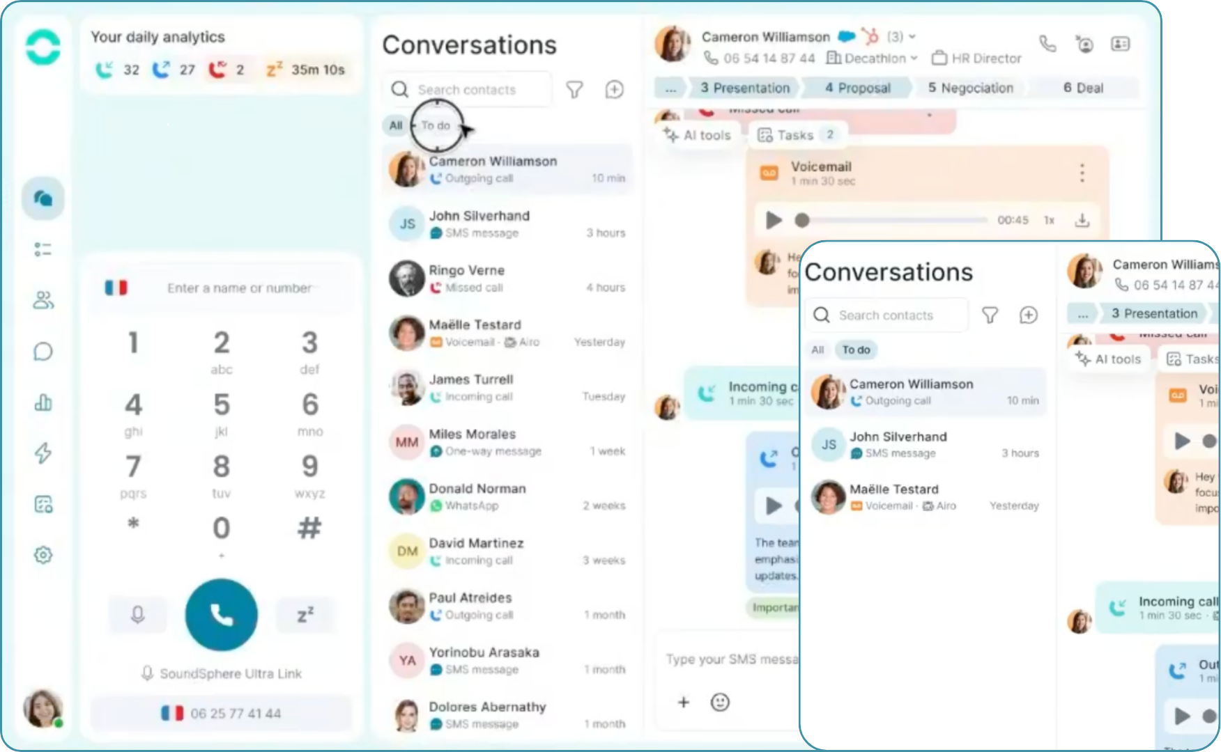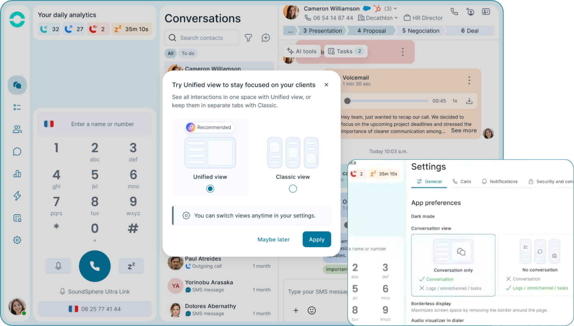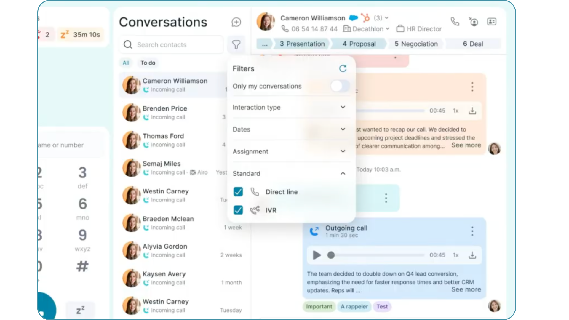 This view is dedicated to managing your priorities. It displays contacts with pending tasks and especially highlights missed calls.