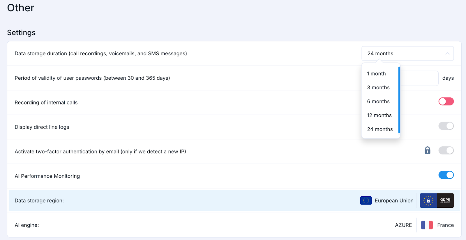 With Empower, call transcriptions, knowledge bases, and voicemails are kept according to the duration defined by the account Administrator directly on the Dashboard. Upon termination of the contract, the client has a 30-day period to retrieve their data before it is permanently deleted from the Ringover ecosystem.