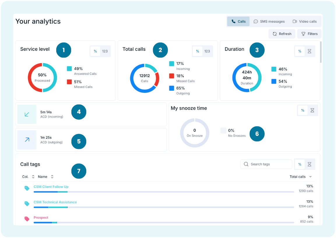Accessing your analytics allows you to track your communication performance and measure your efficiency. In this guide, you’ll learn how to view your call, SMS, and video statistics, as well as apply filters to refine your data.
