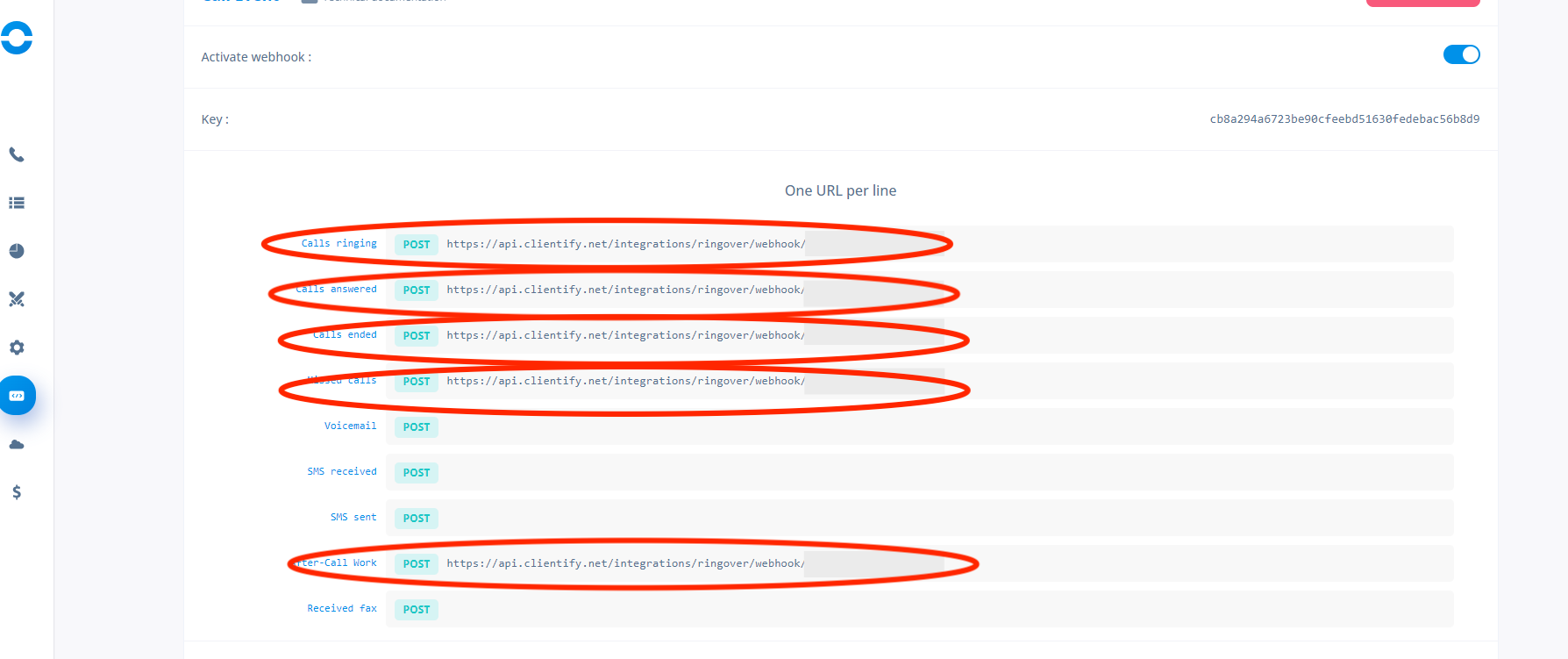 Paste the webhook URL into the Webhook menu of your Ringover dashboard in the fields “Ringing Calls”, “Hung up Calls”, “Hung up Calls” and “Missed Calls”. As well as in the “URL” field of the Contact Call webhook.