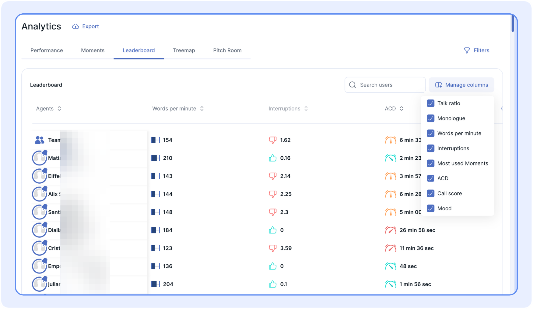 In the leaderboard section, the data is presented by agent. You can choose the columns you wish to display.