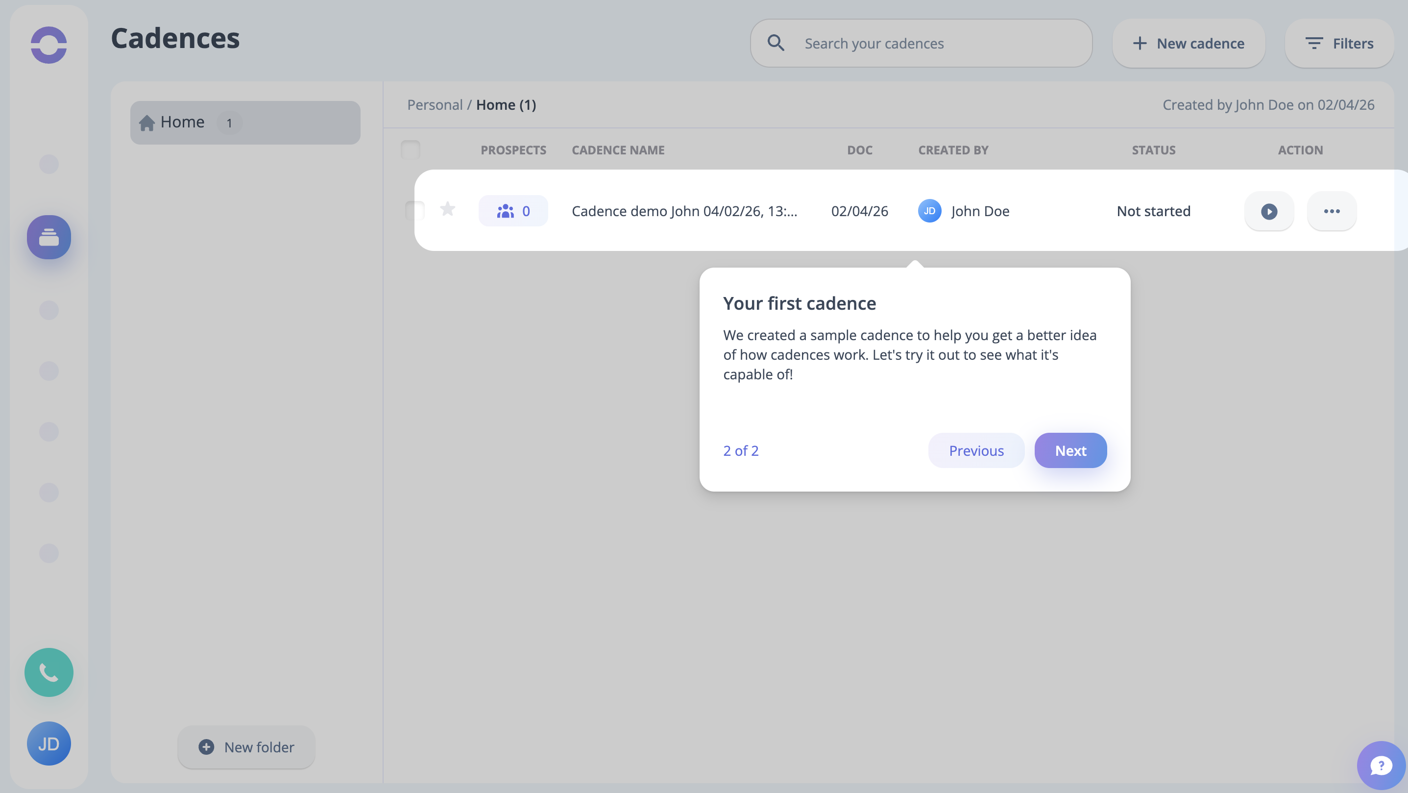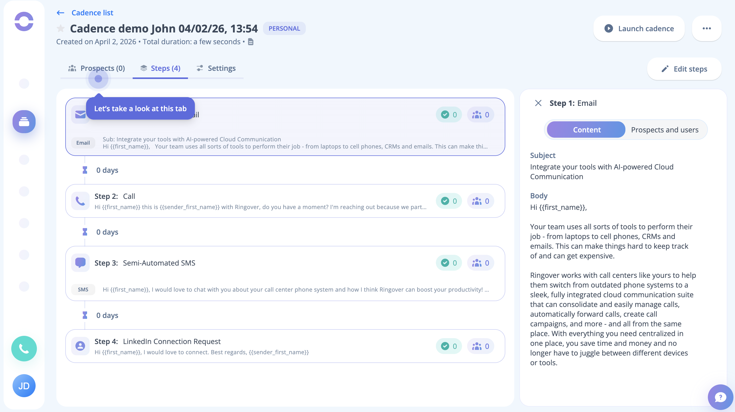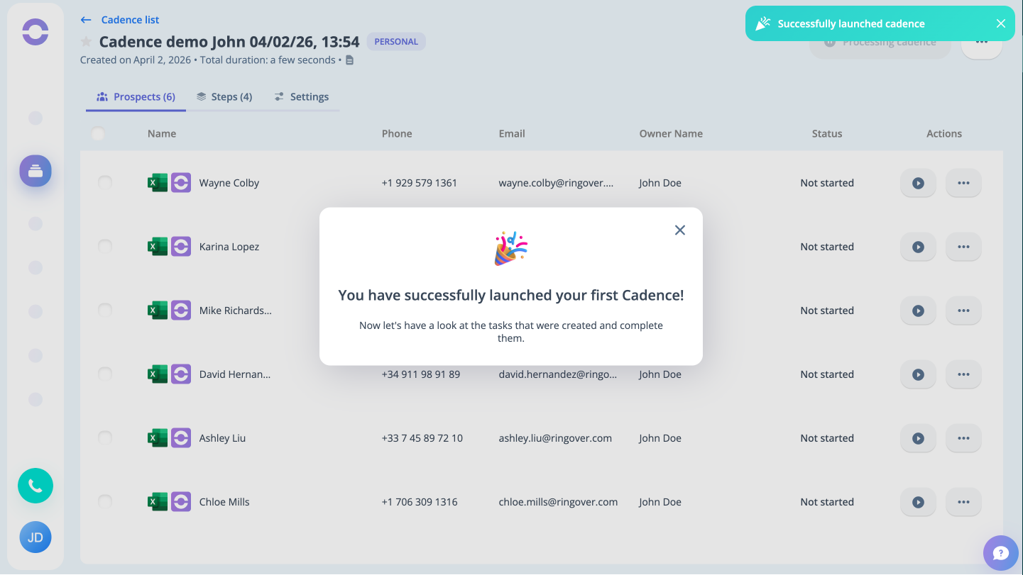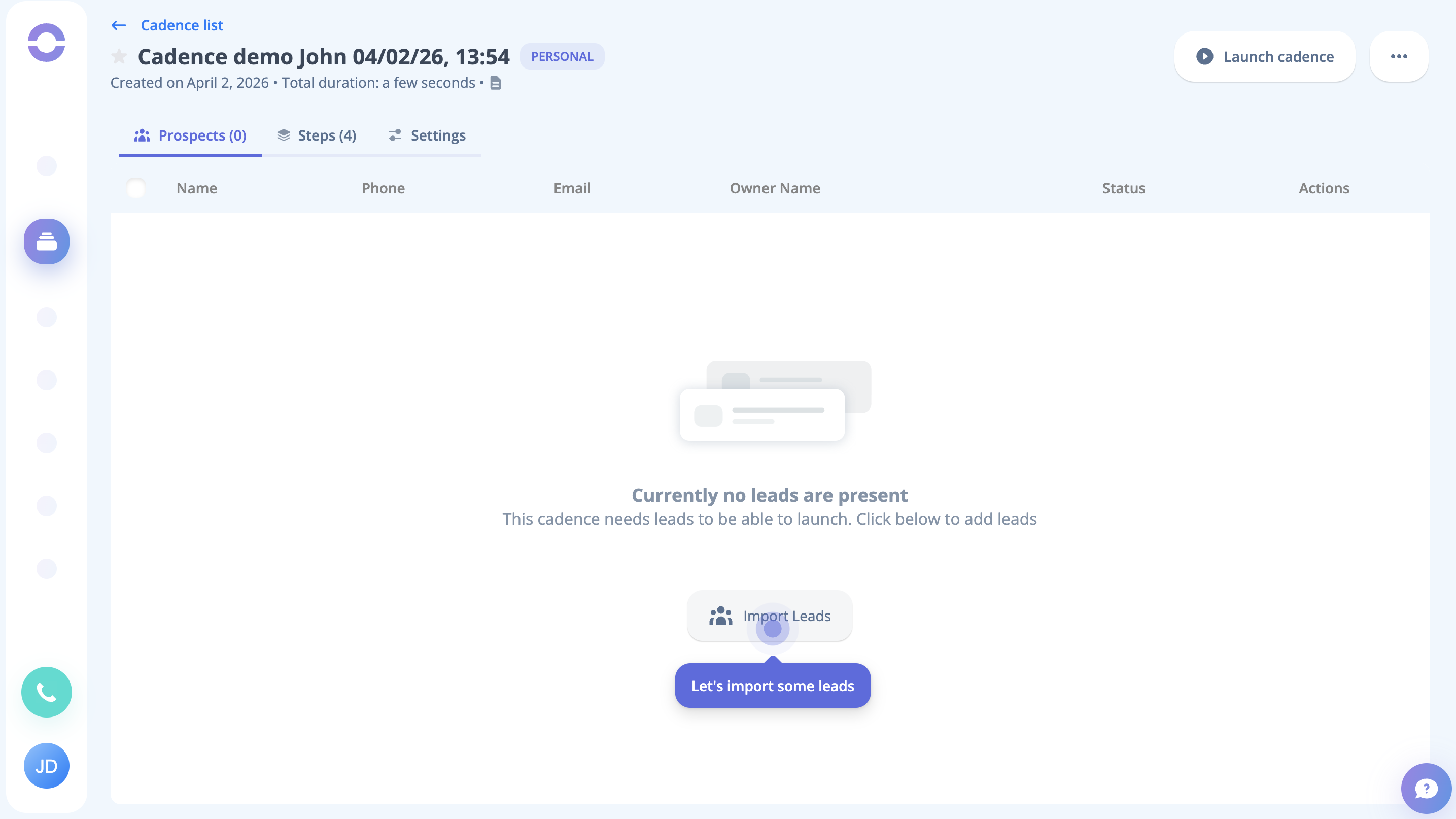 Step 14: You can notice the Let's Launch Your First Cadence prompt at this stage; click on the button to do so.