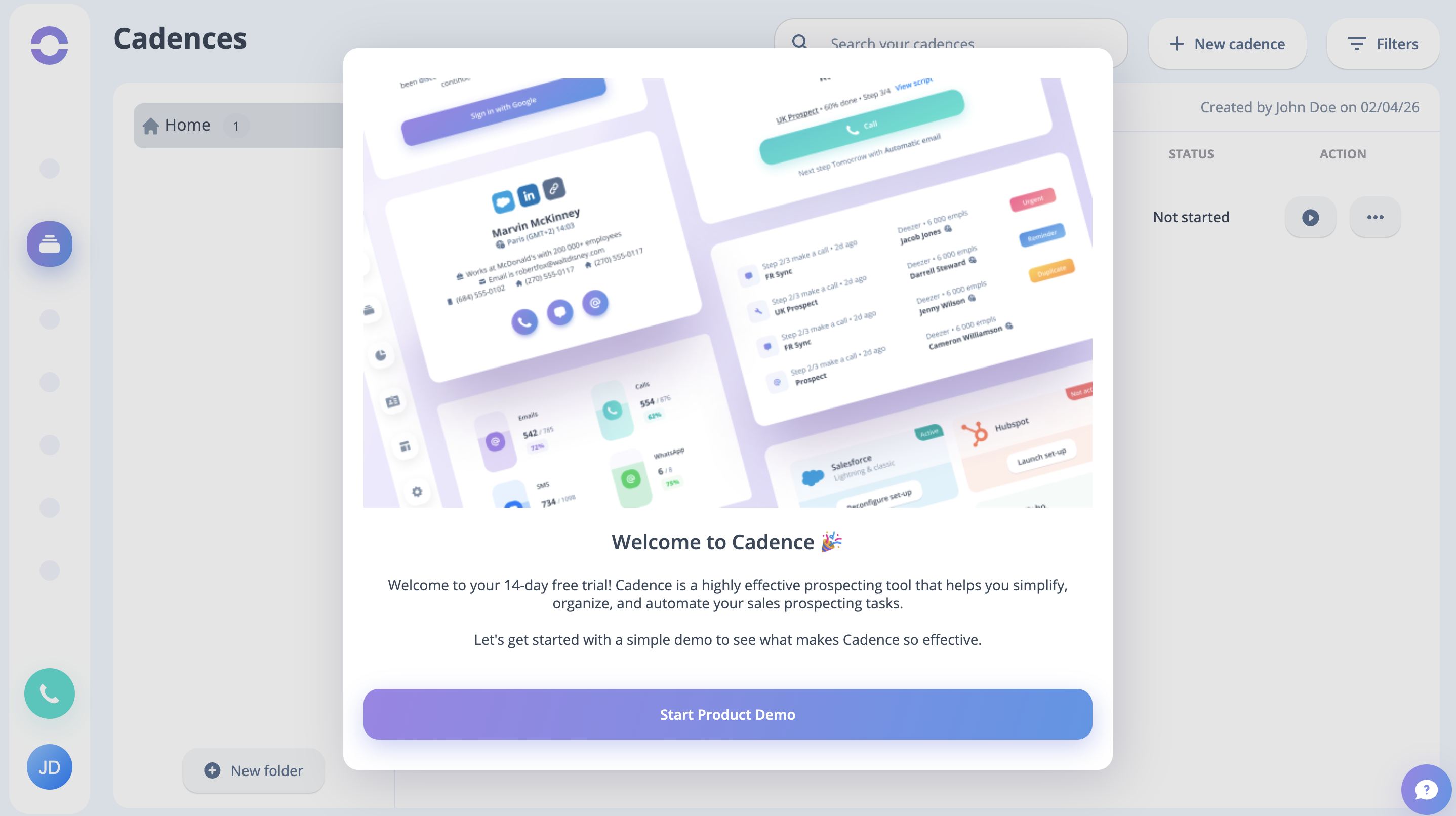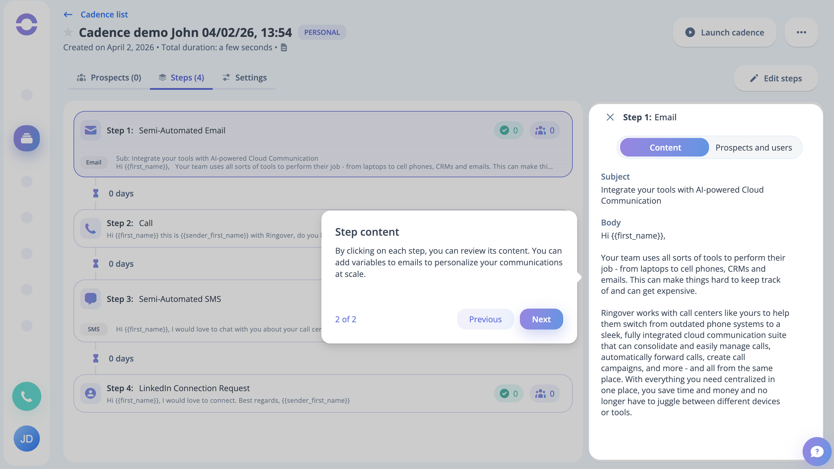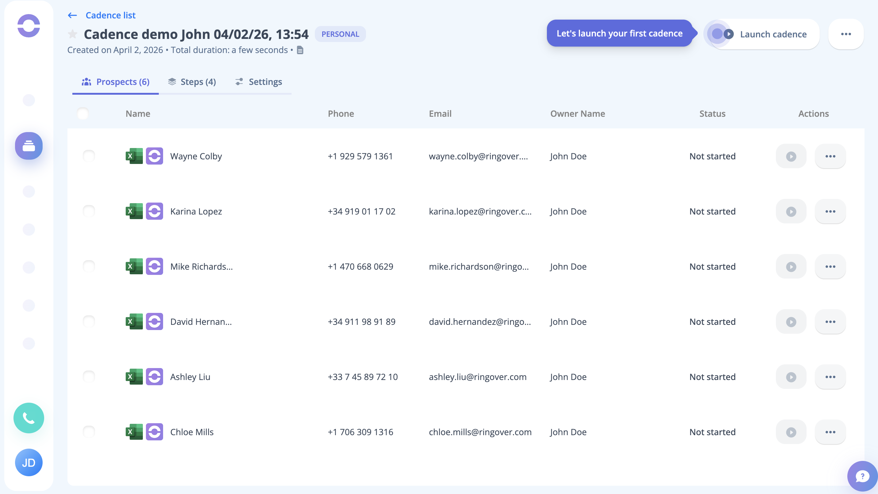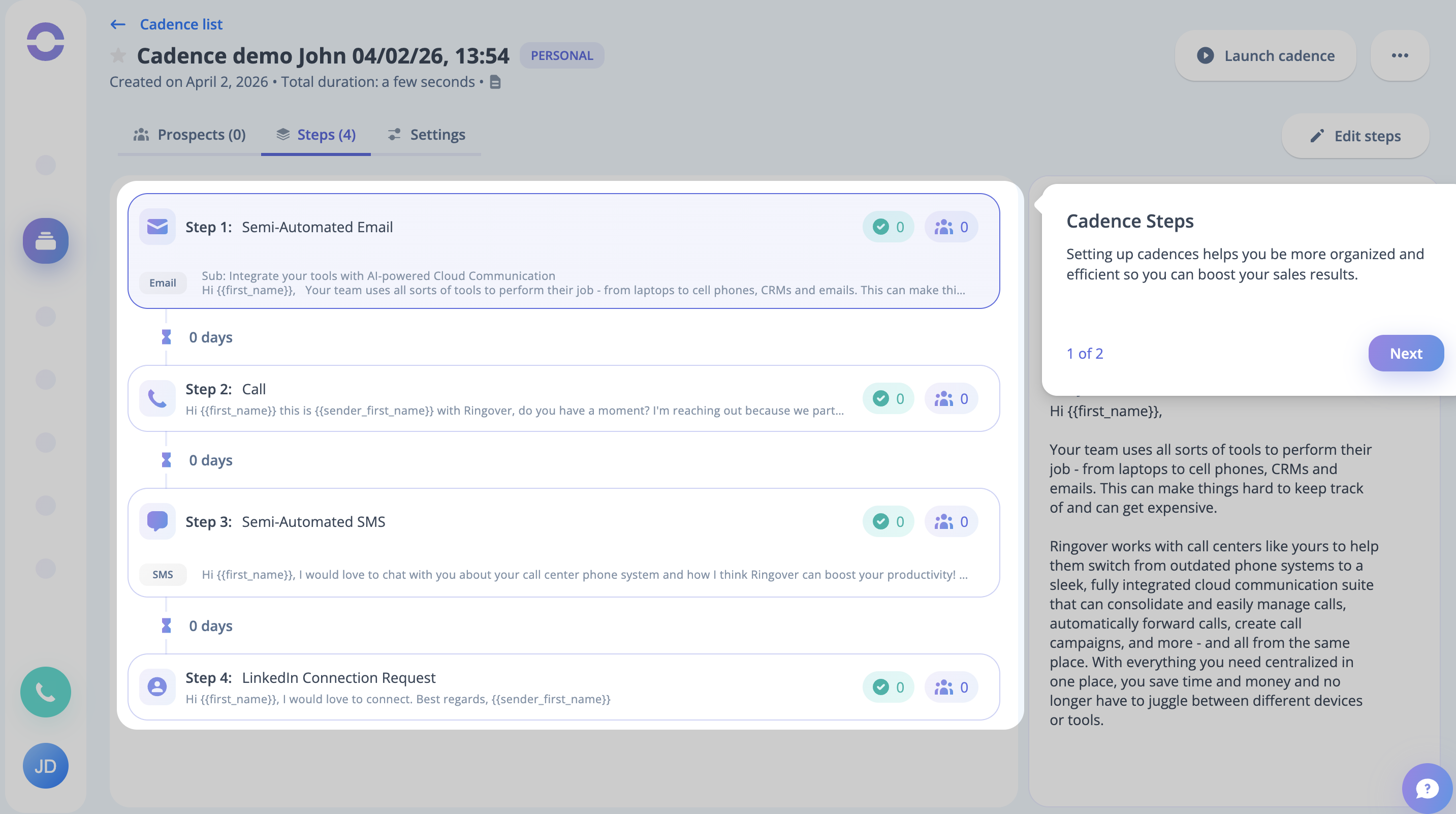 Step 14: You can notice the Let's Launch Your First Cadence prompt at this stage; click on the button to do so.