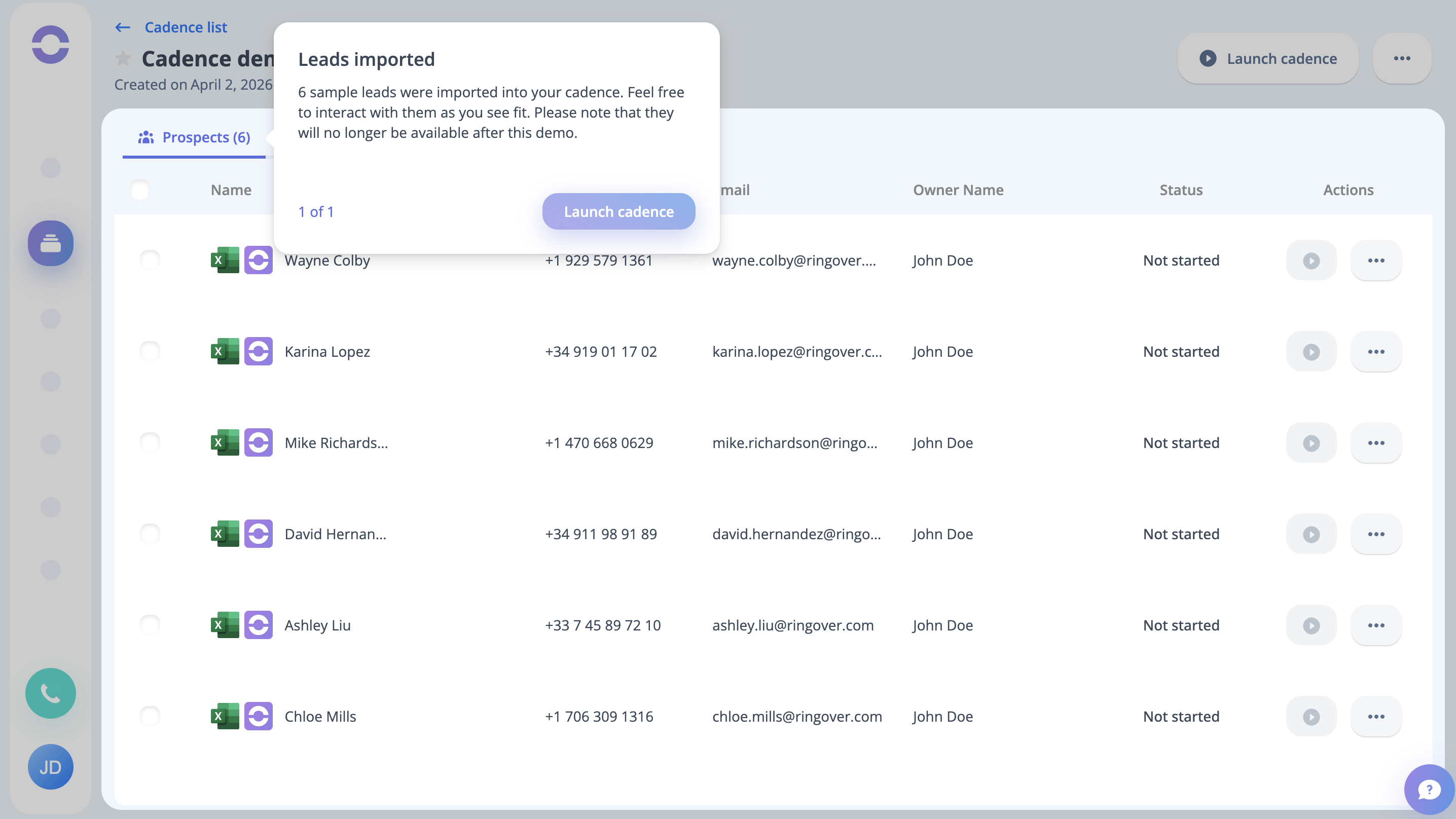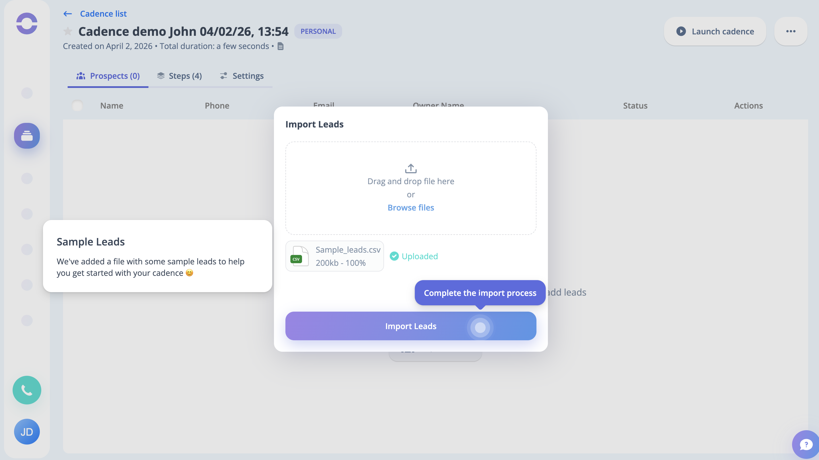 Step 13: Now the sample leads are imported into the particular Cadence, which will no longer be available after the demonstration. Now click on the Launch Cadence button.