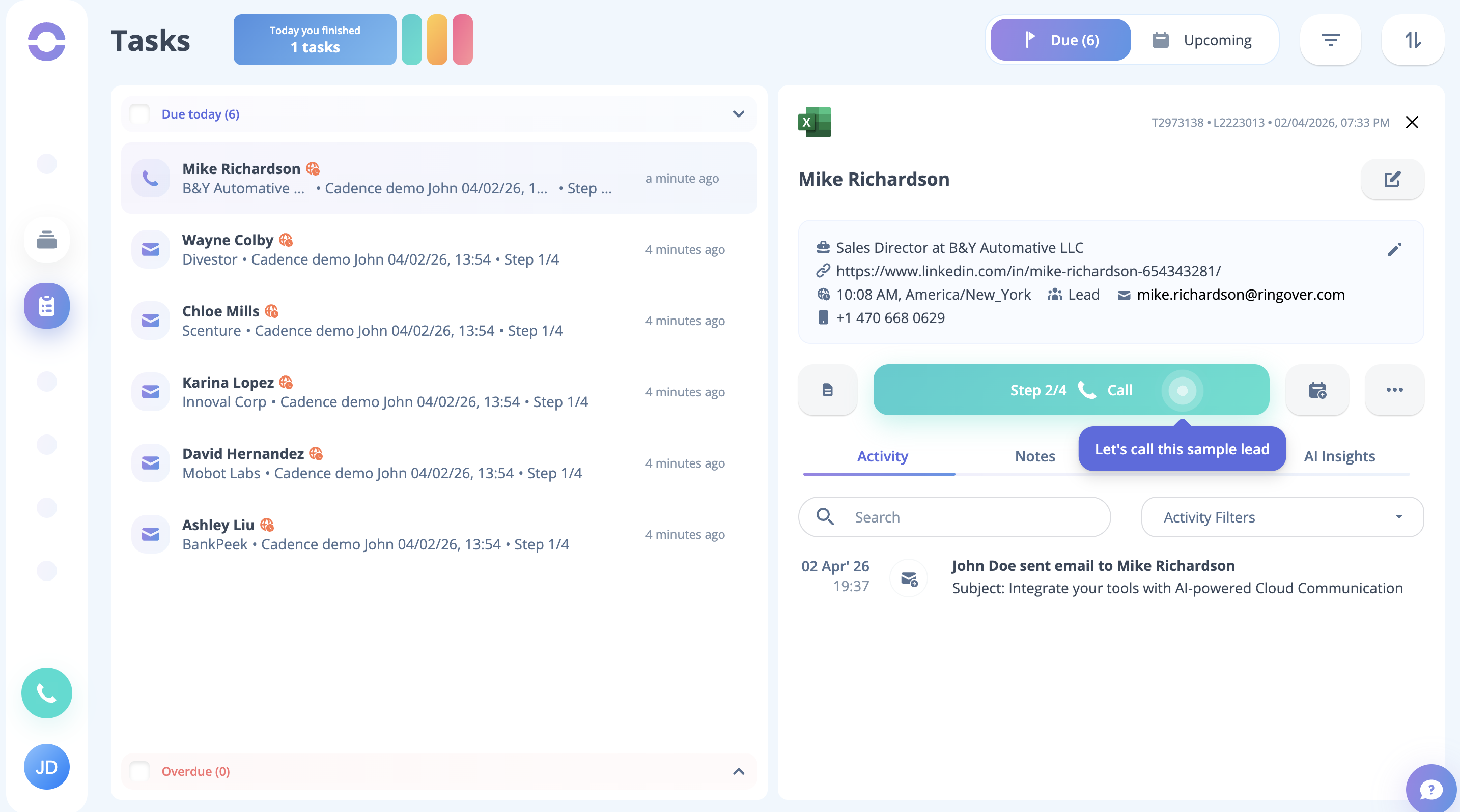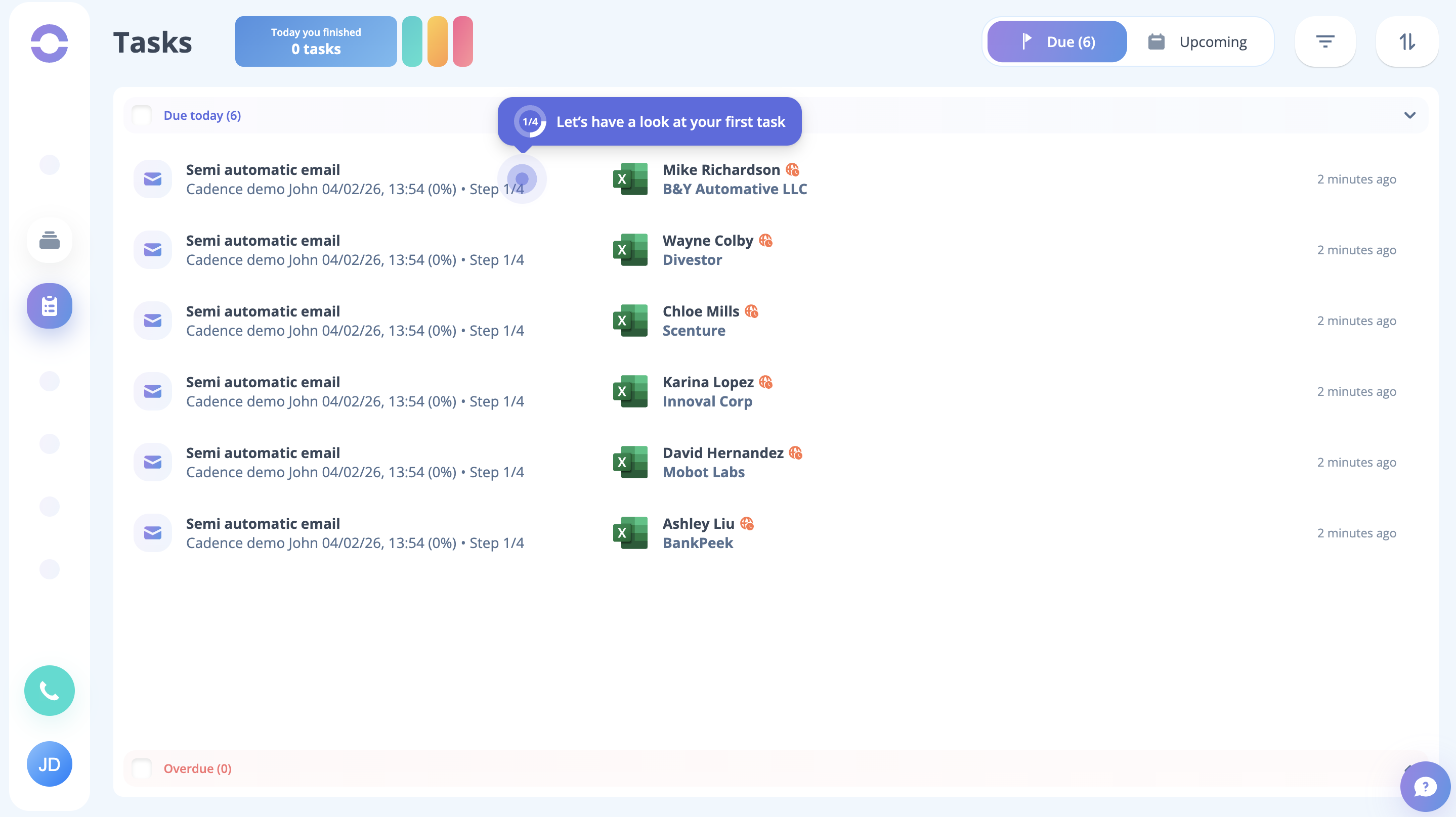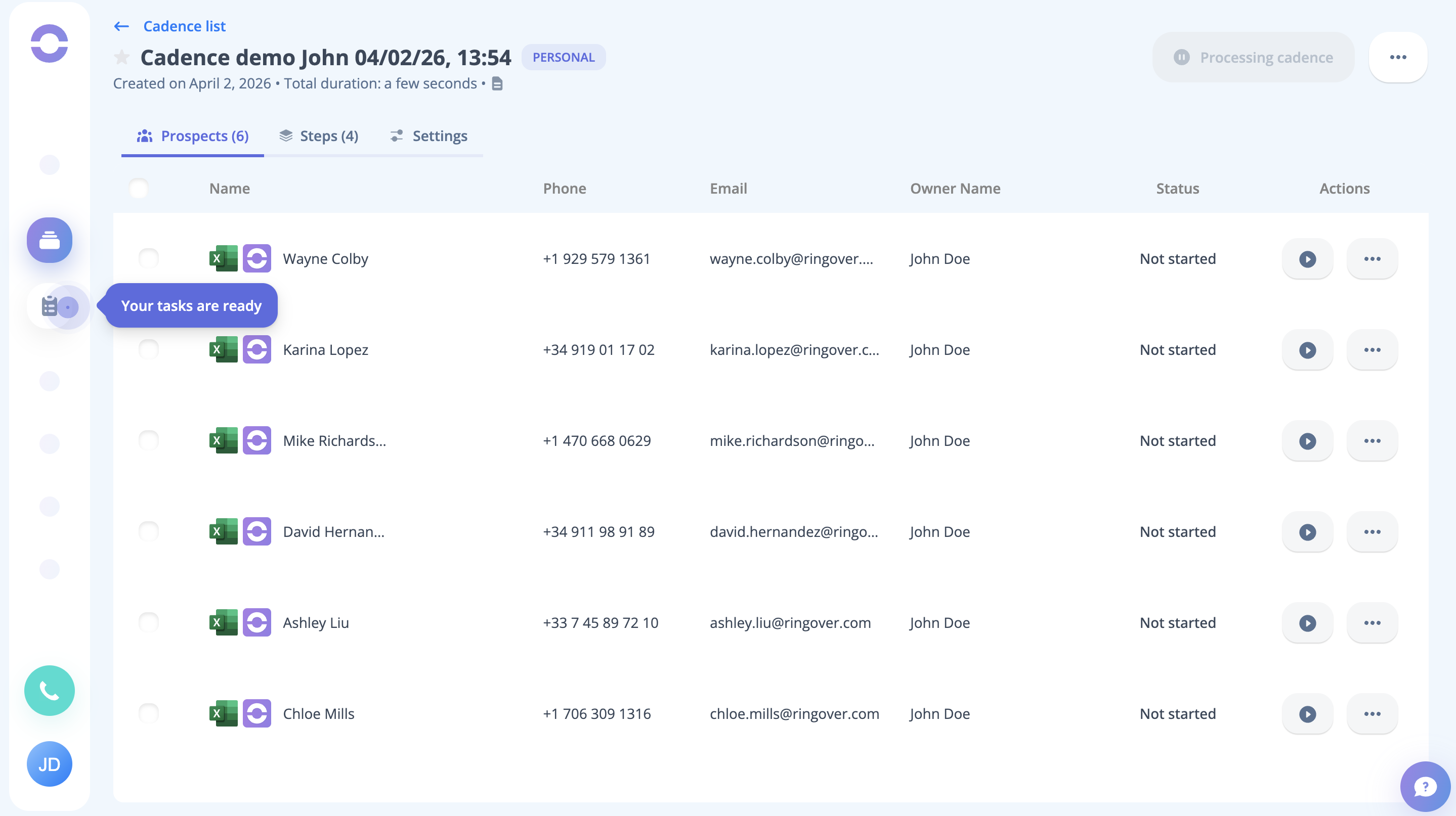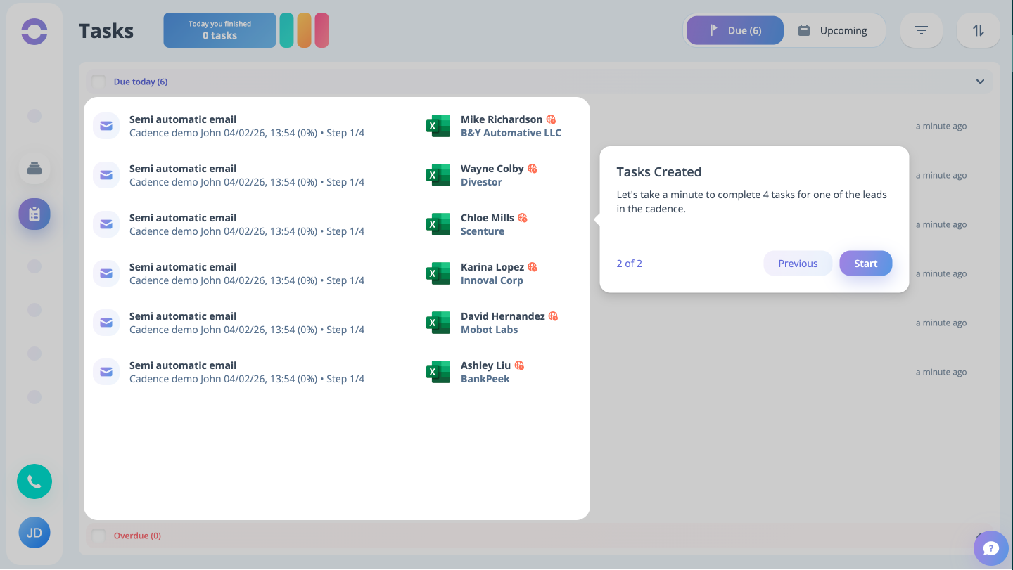 As the cadence is launched, you can see on the task page that the tasks are created for all the dummy leads present in the cadence. Just click the Start button to begin the process.