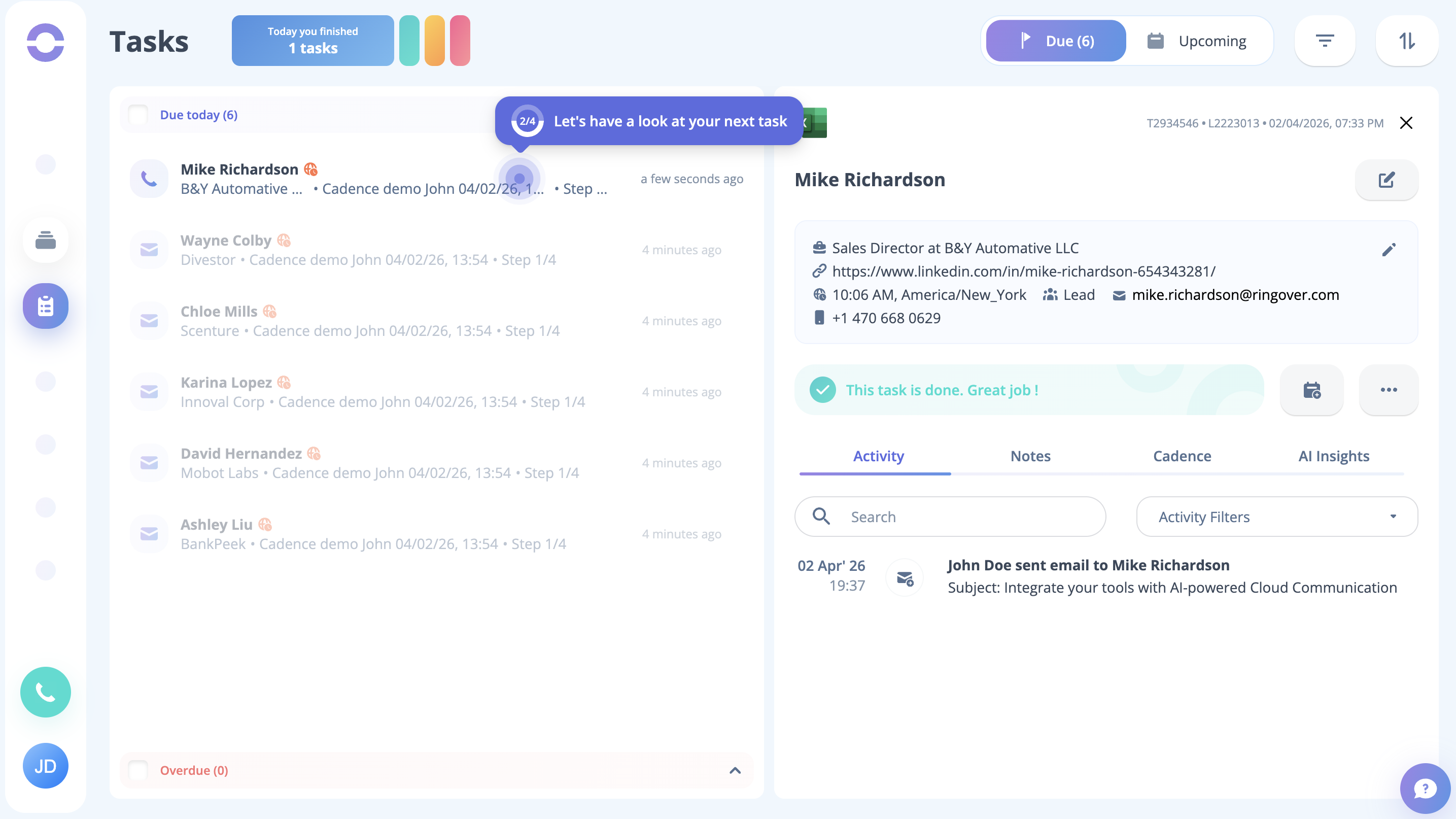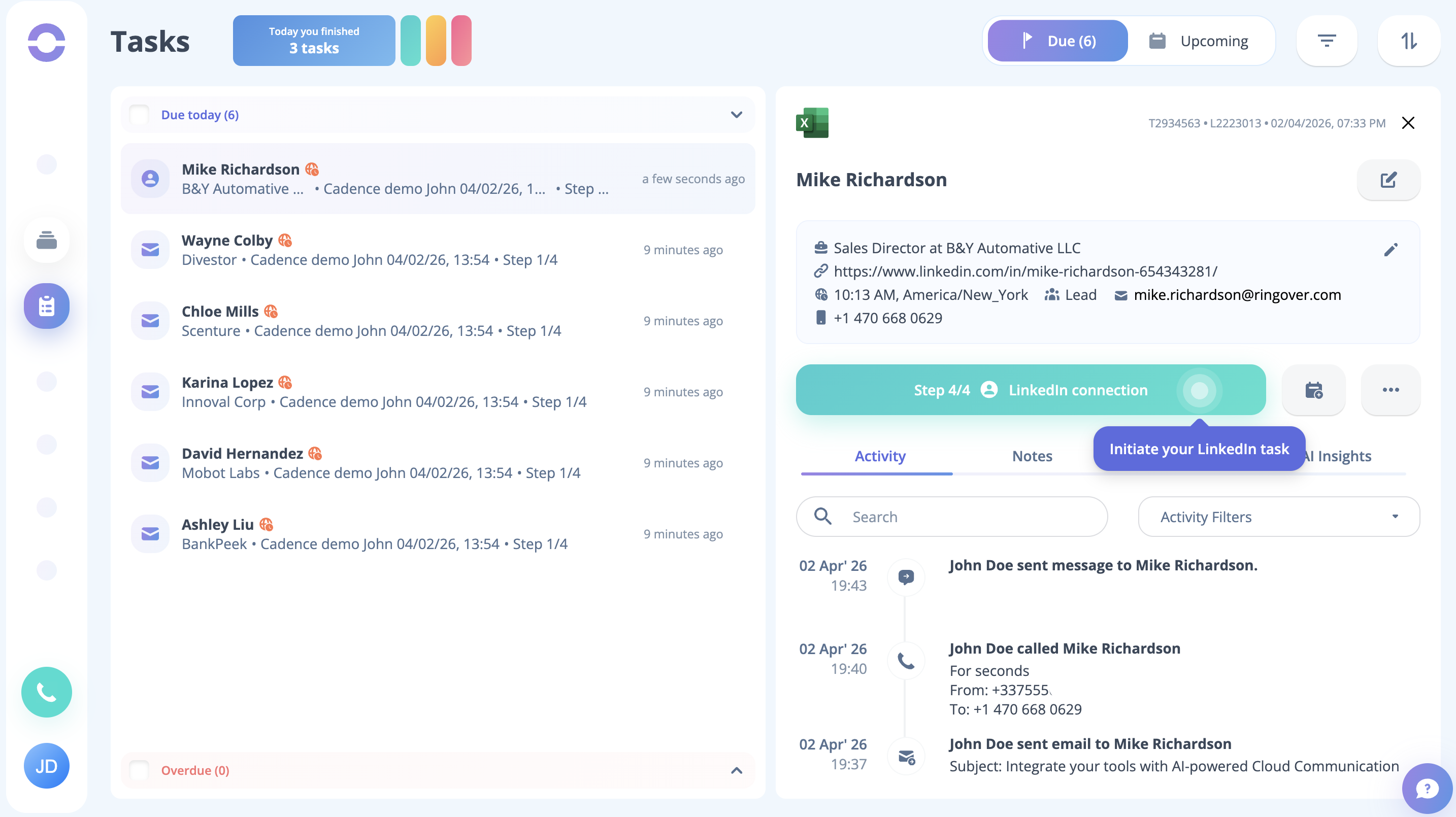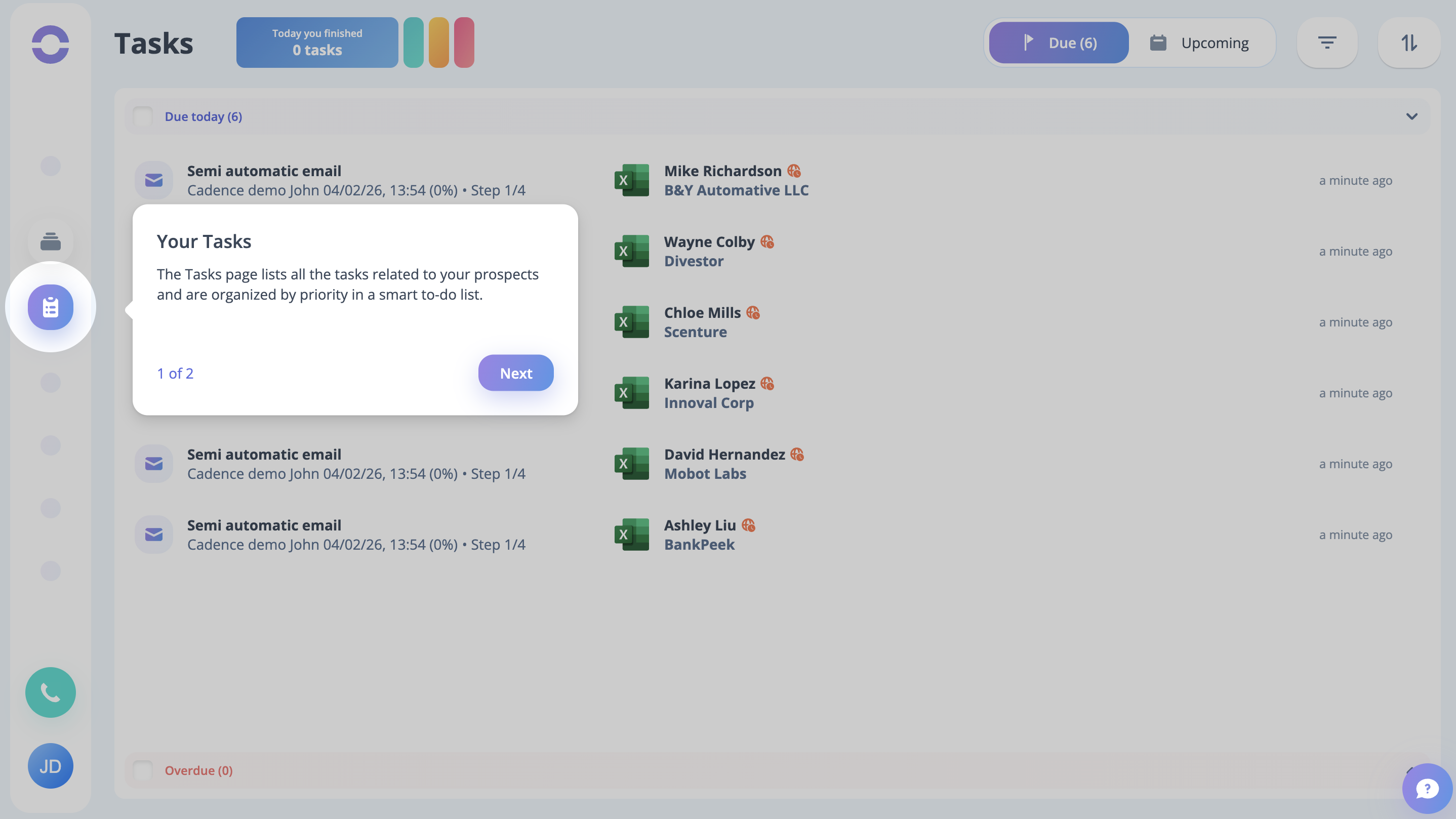 As the cadence is launched, you can see on the task page that the tasks are created for all the dummy leads present in the cadence. Just click the Start button to begin the process.
