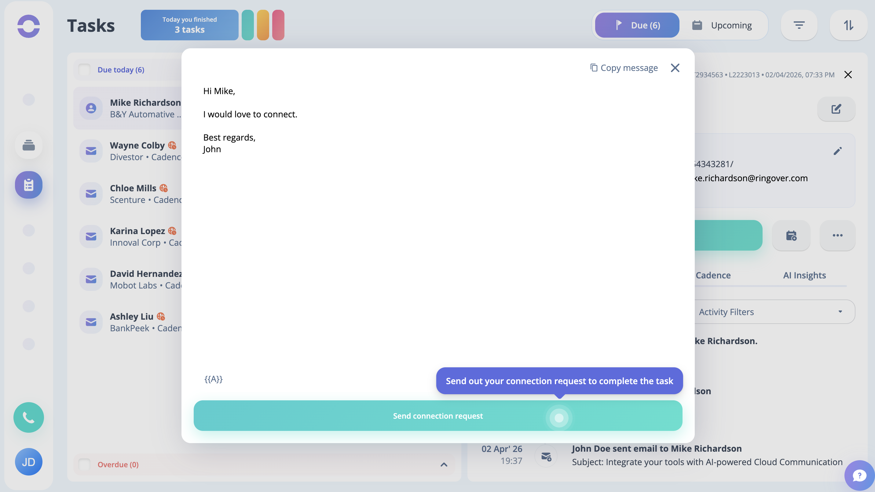 Step 26: Like previously, you can see your next task. Click on the LinkedIn Connection button on the modal, and to perform the task.