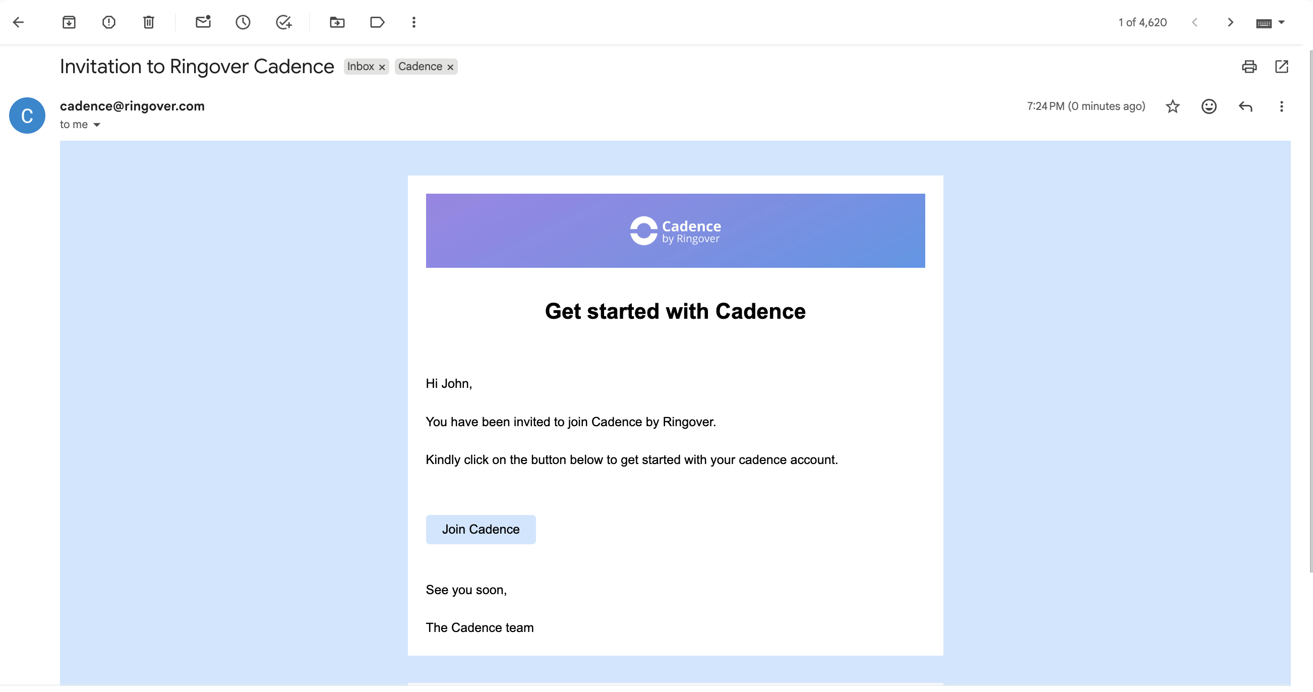 Step 1: You will get an invitation to open the Cadence account in your Gmail. Click the Join Cadence button to get started.