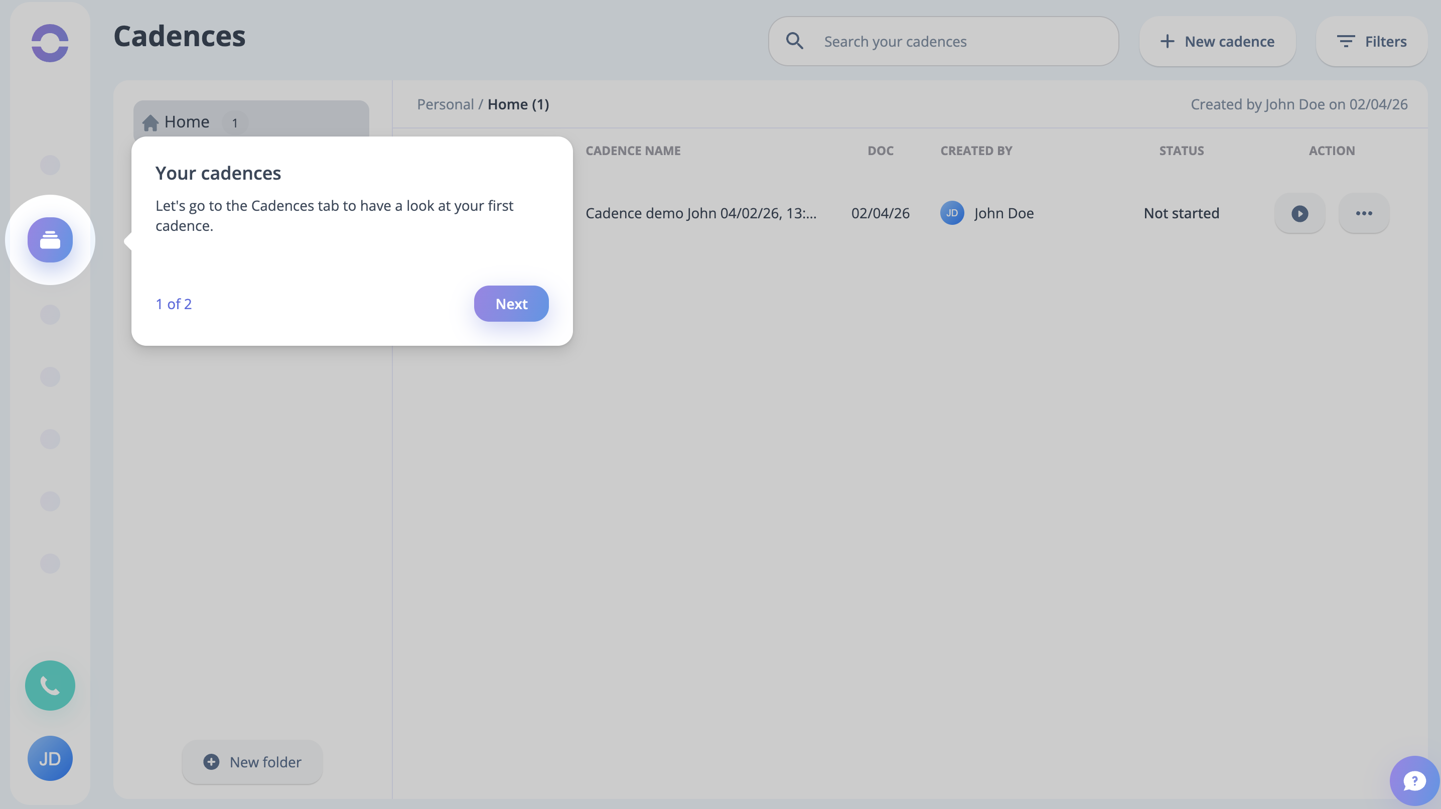 Step 5: You will be directed to the Cadence page in the following step. Clicking on the Next button will display your first Cadence for you to view.