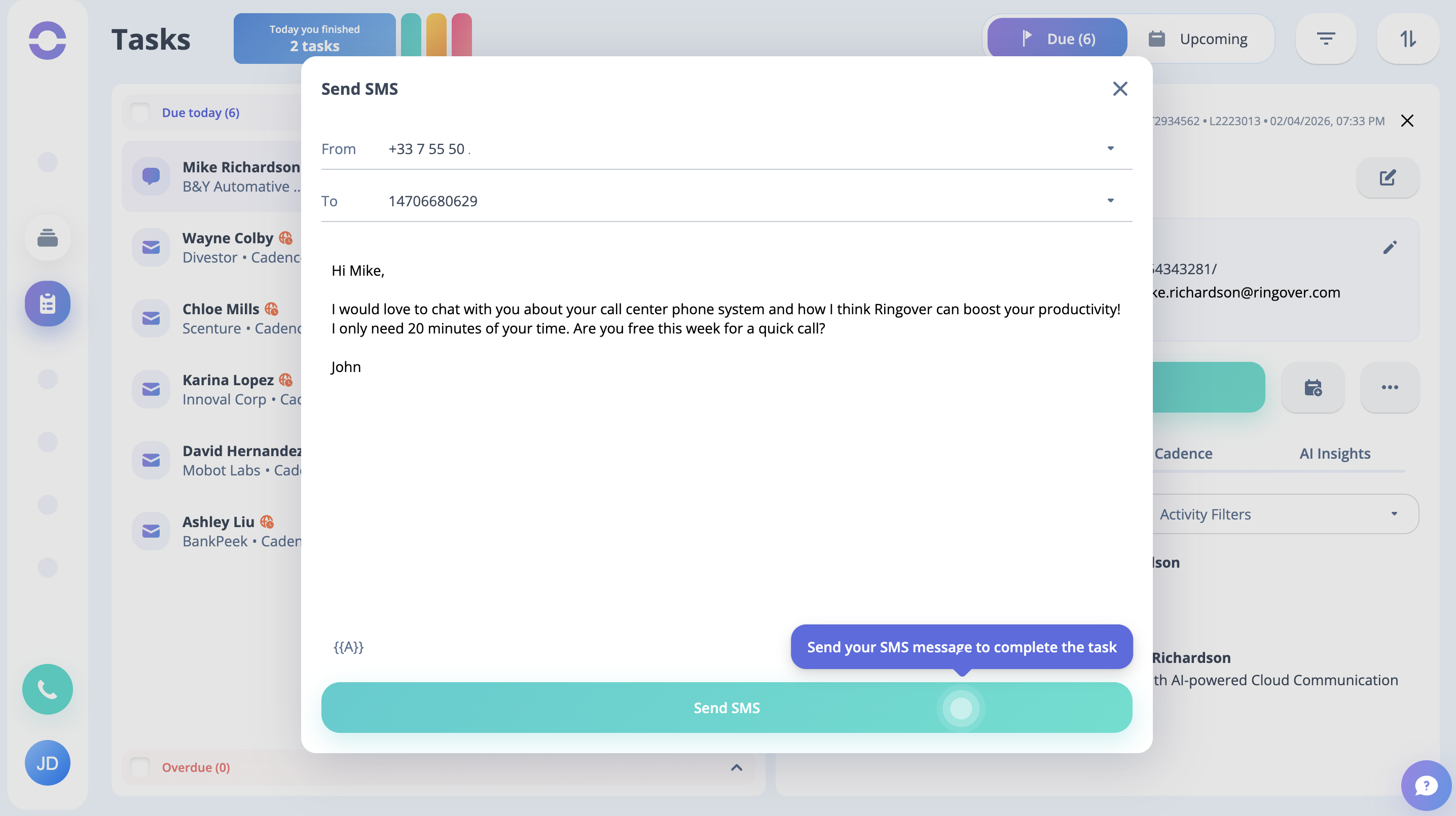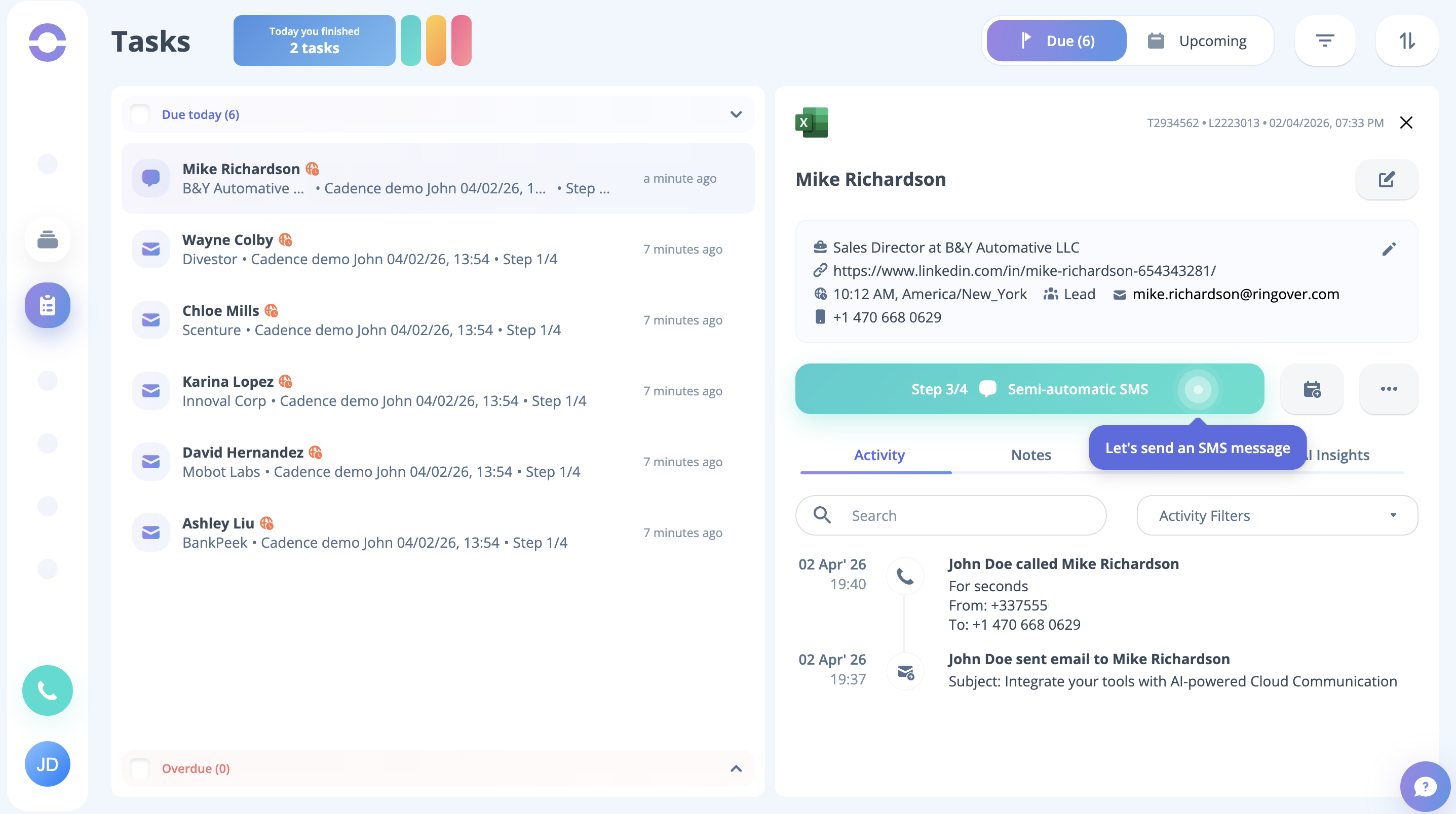 Step 24: Like previously, you can see your next task. Click on the Semi Automated SMS button on the modal, and the task will be performed.