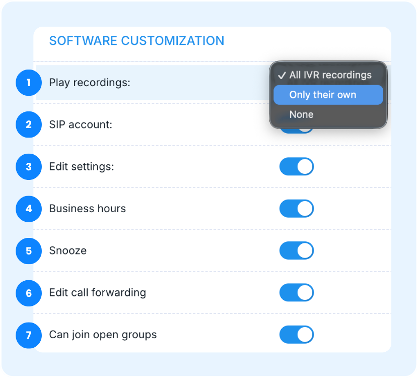 Start by navigating to your user permissions settings. You will find the three biggest sections to manage: Software Customization, Calls, and Recording and Supervision.