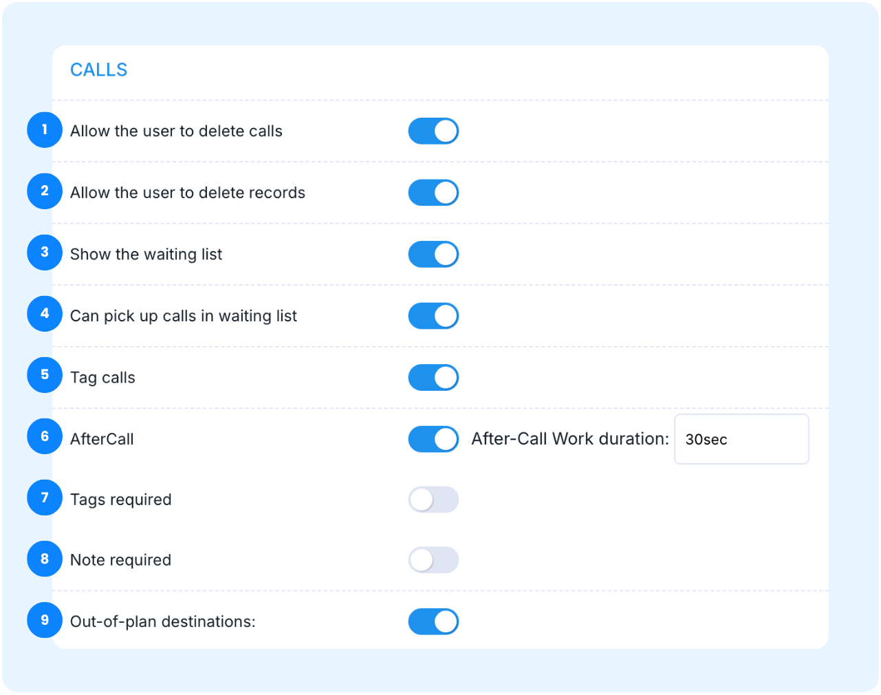 Tag calls: allows displaying or hiding the "Tag" field during and after the call. If the permission is enabled, the user can tag their calls. See our article "Authorizing your users to tag their calls".