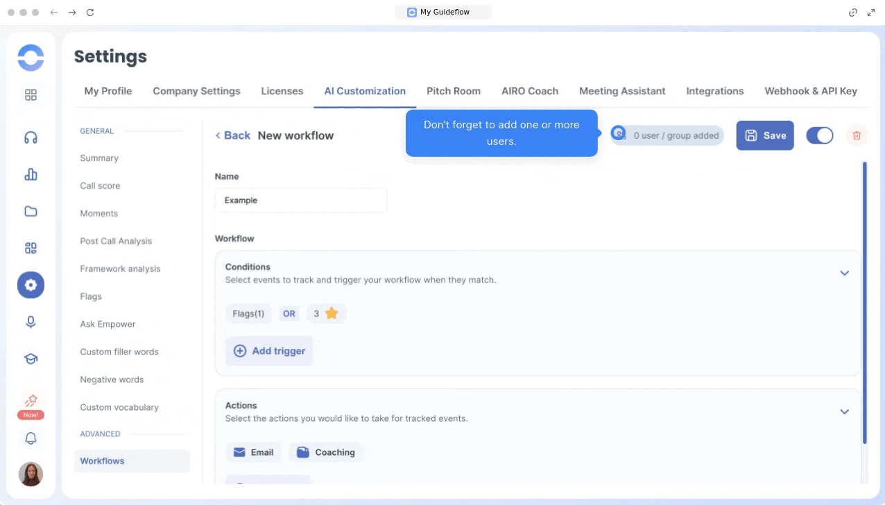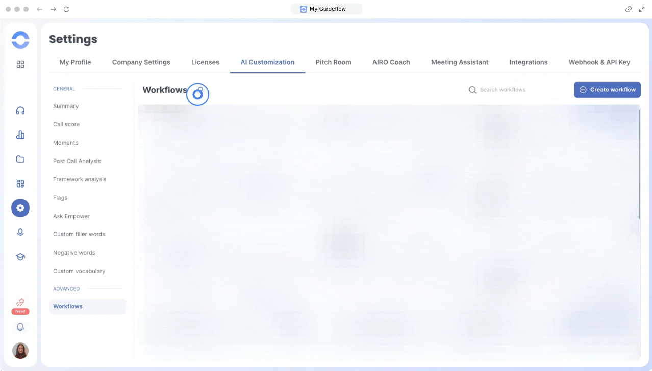 To create your workflow, go to the Workflows section under AI Customization in your Empower workspace and click “Create a workflow”.