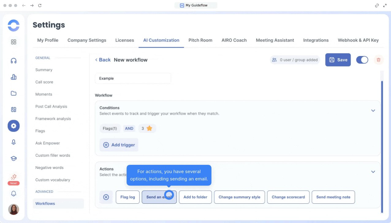 In actions, you can adapt the style of your call summary depending on applied conditions, modify the scorecard according to call type (support, sales, etc.), change the summary style, or even send a meeting note.
