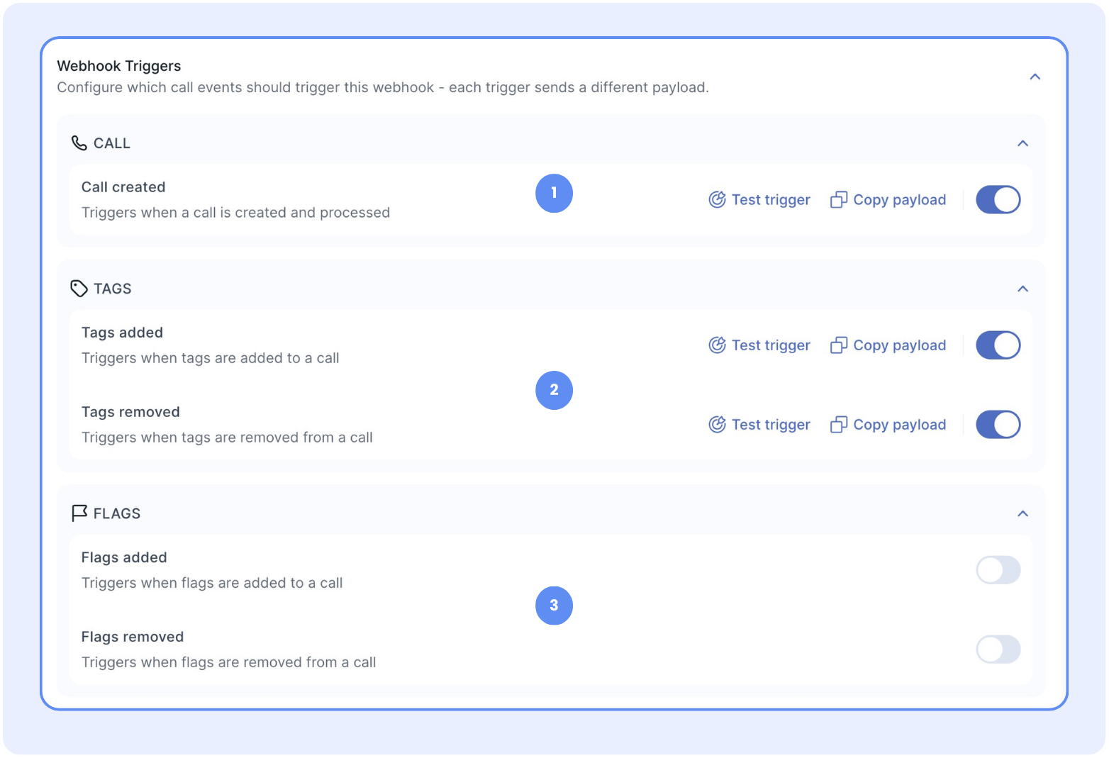 - A tag is added to or removed from a call.