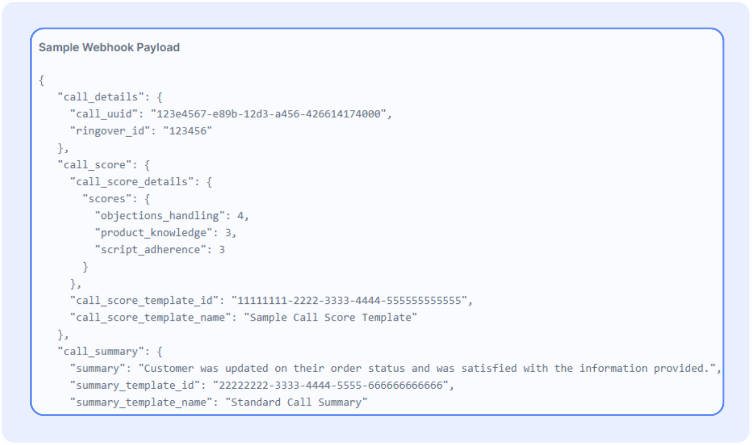 - The standard JSON payload automatically sent after a call analysis typically includes call_details (call identifiers) and call_score (automated evaluation details).