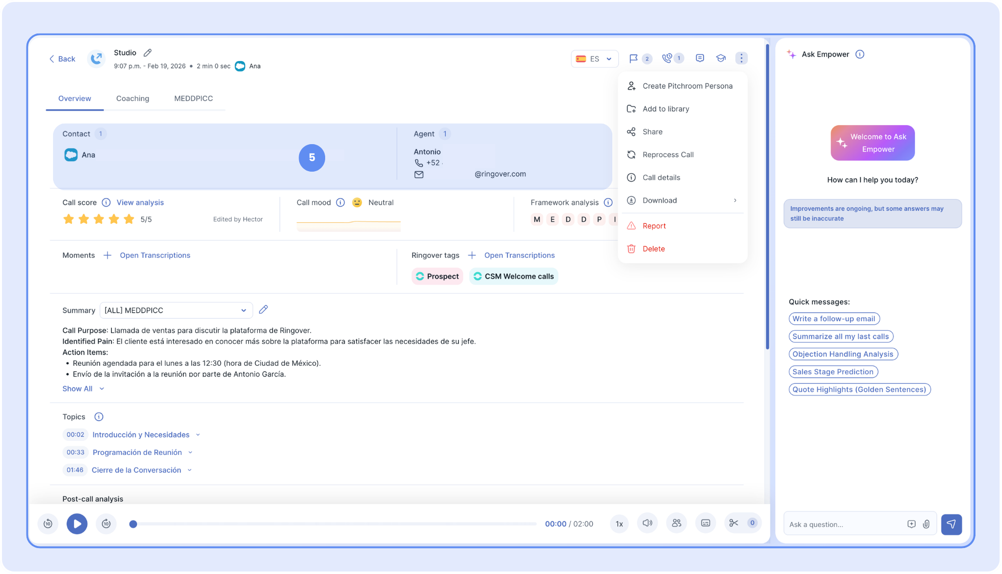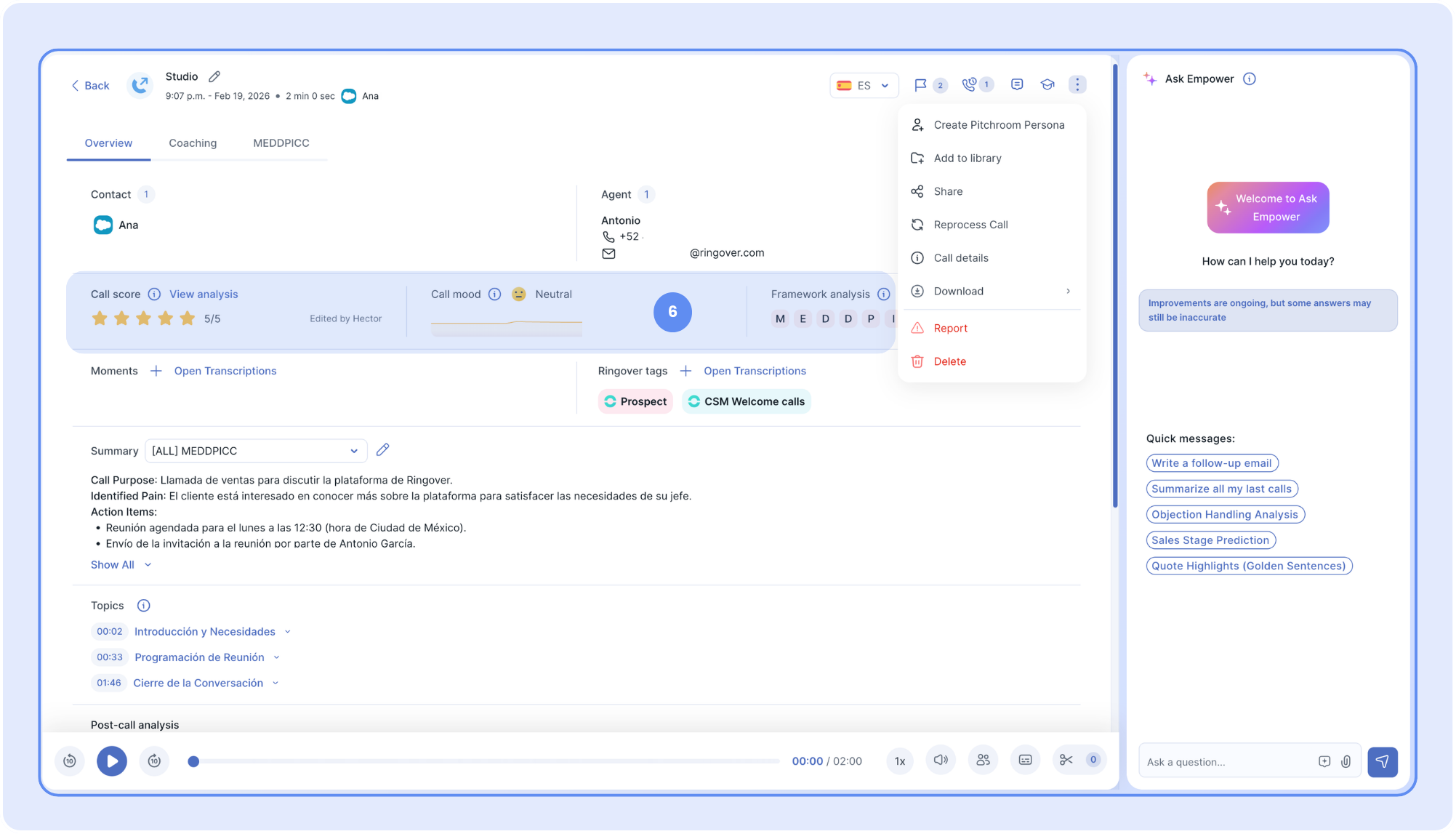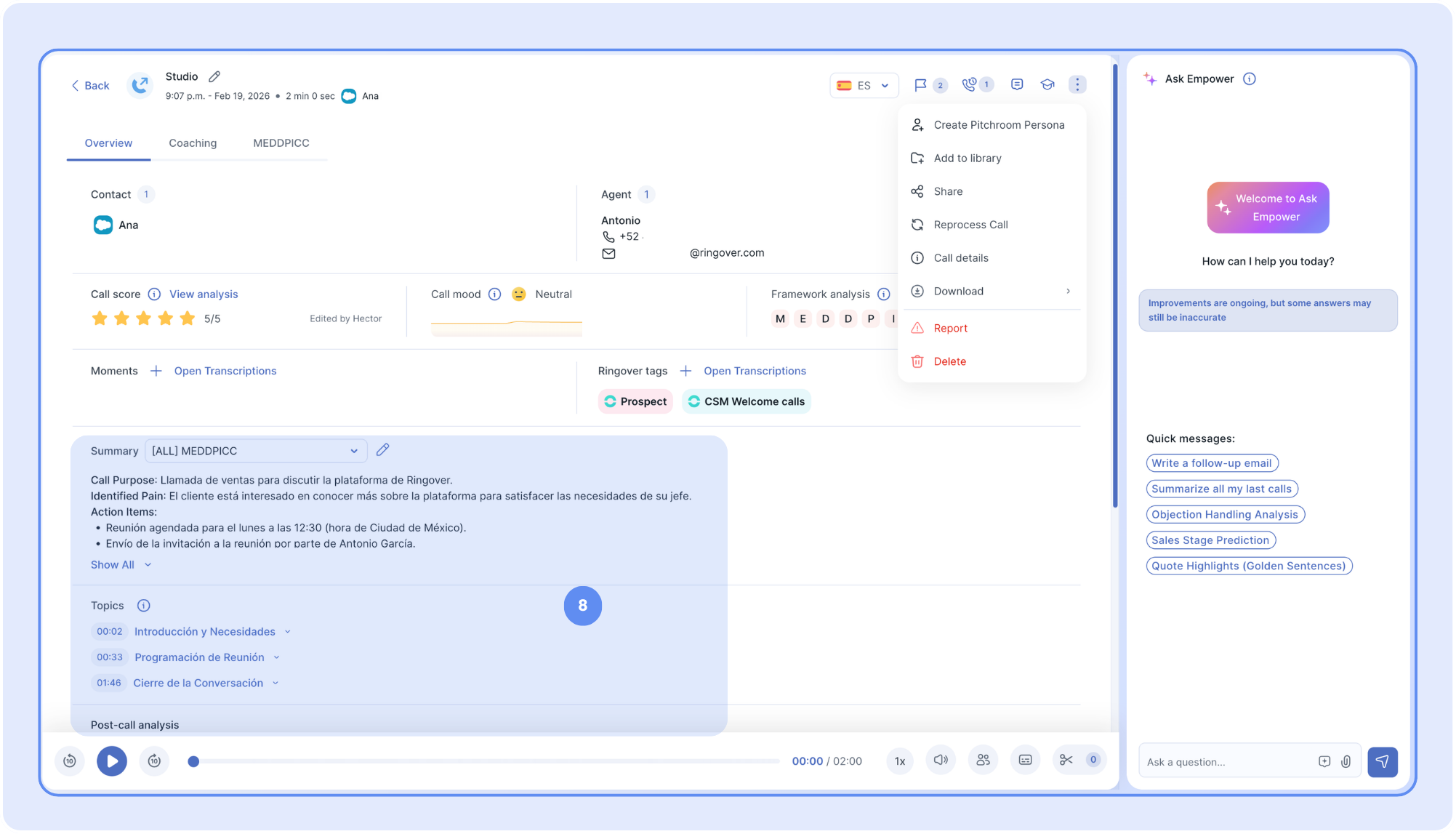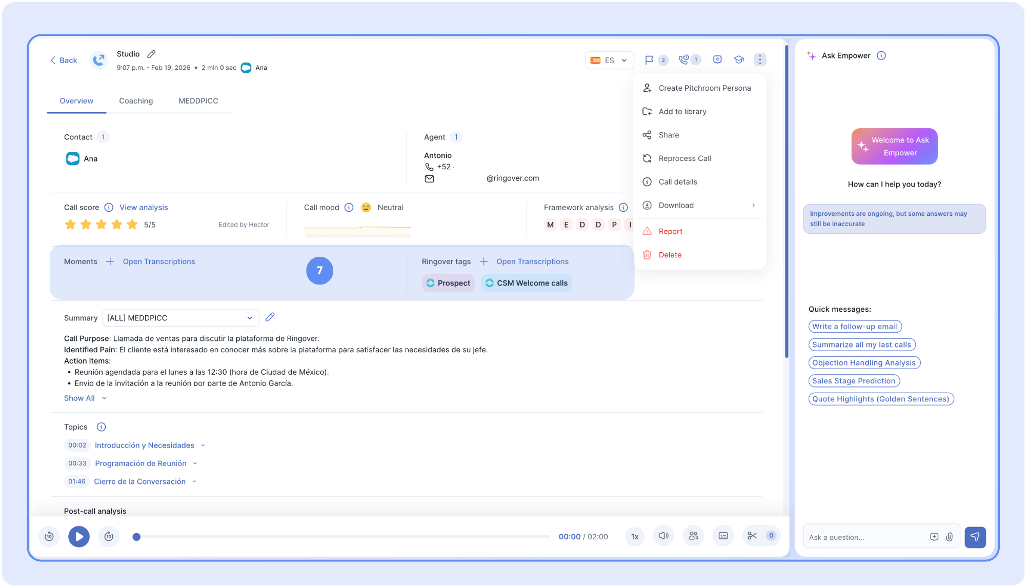 🎉 The Empower's Call Overview page centralizes all the information and tools needed to analyze, review, and share call insights.
