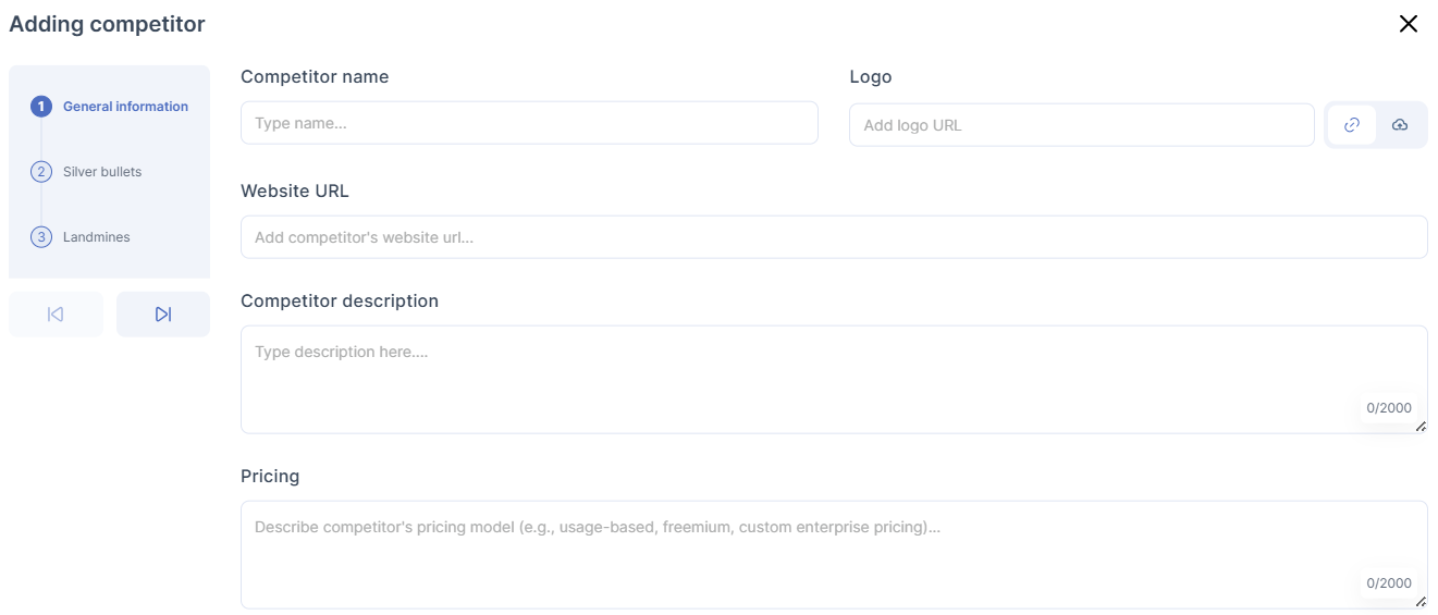 - General Information: competitor name, logo, website, description, pricing model.