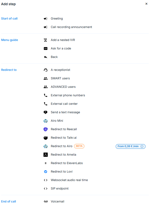 Configure your add-on by integrating it into your IVRs. To do this, go back to Dashboard> Store> Voice Menus, select your IVR and add a step under "Redirect to" by selecting the option: