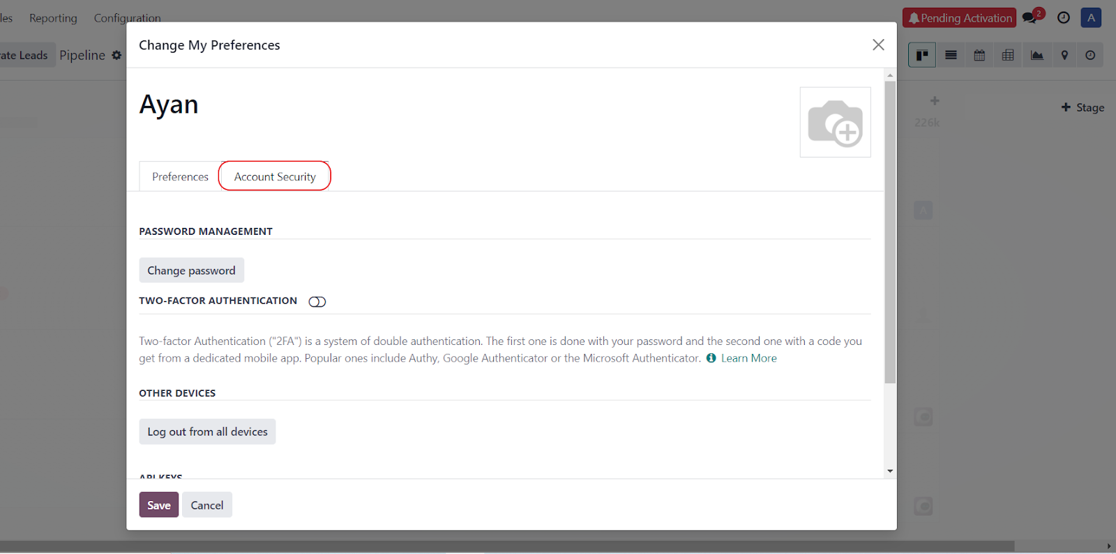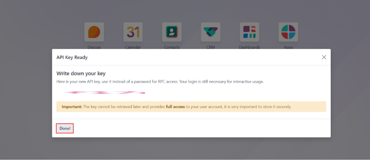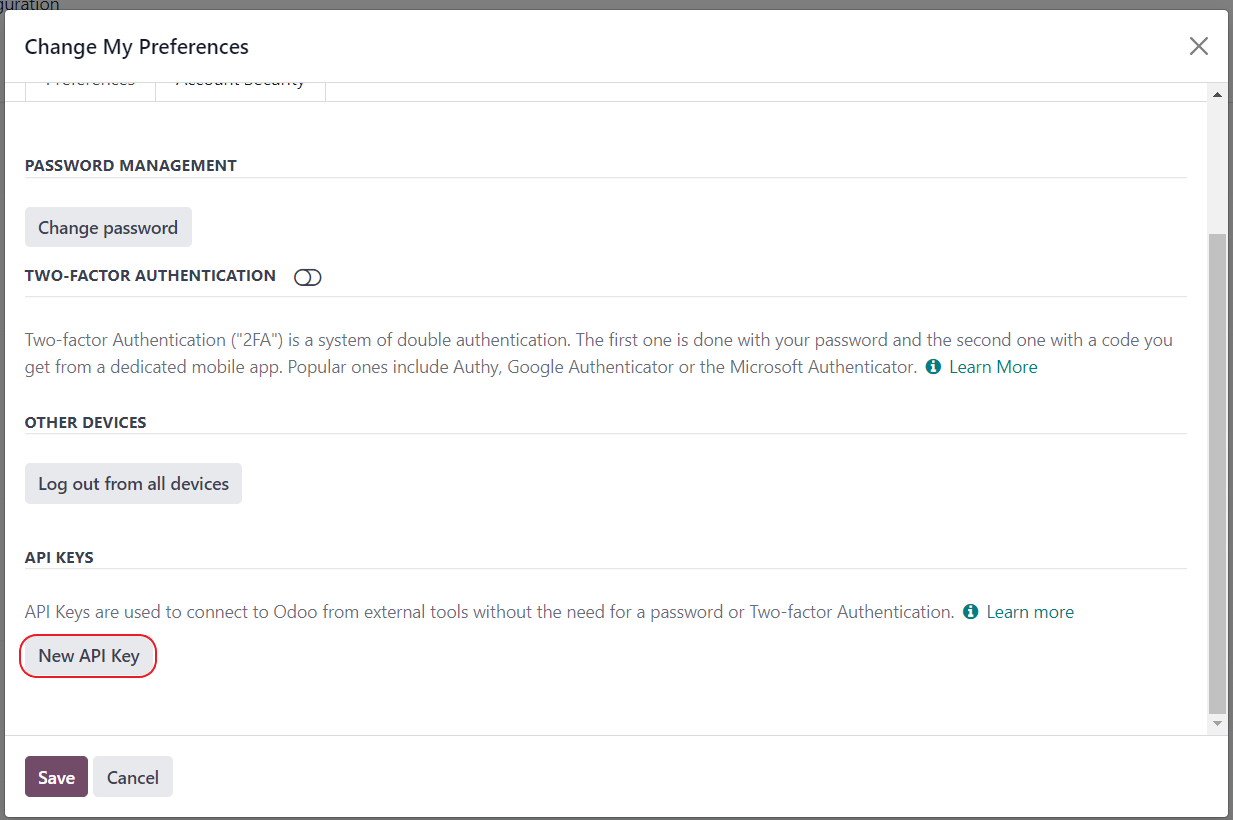 About: In Odoo, we can generate API keys that can be used for authentication purposes. A user can generate any number of keys based on their purpose and also delete keys if they are no longer needed.