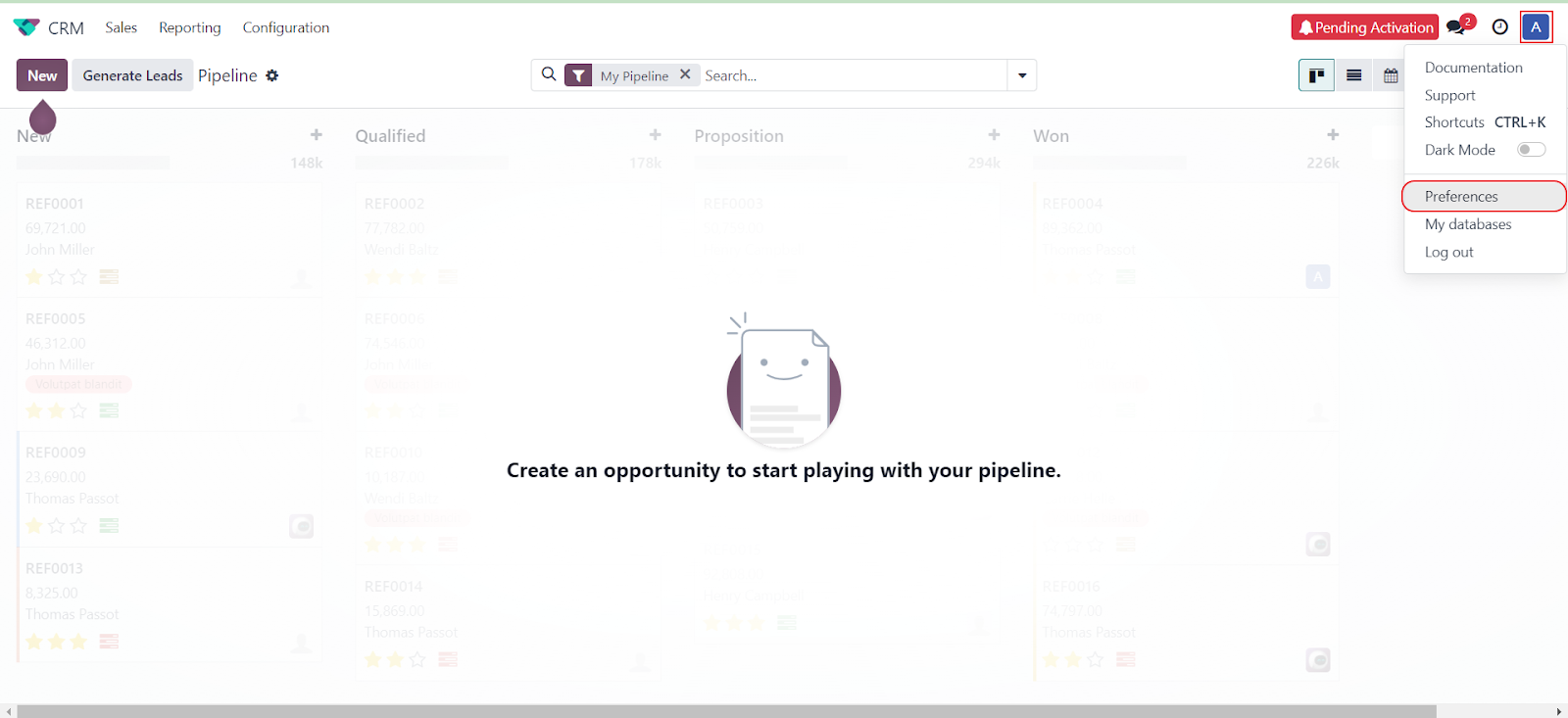 Step 1: On your Odoo account, Go to your profile icon, and then click on Preferences.
