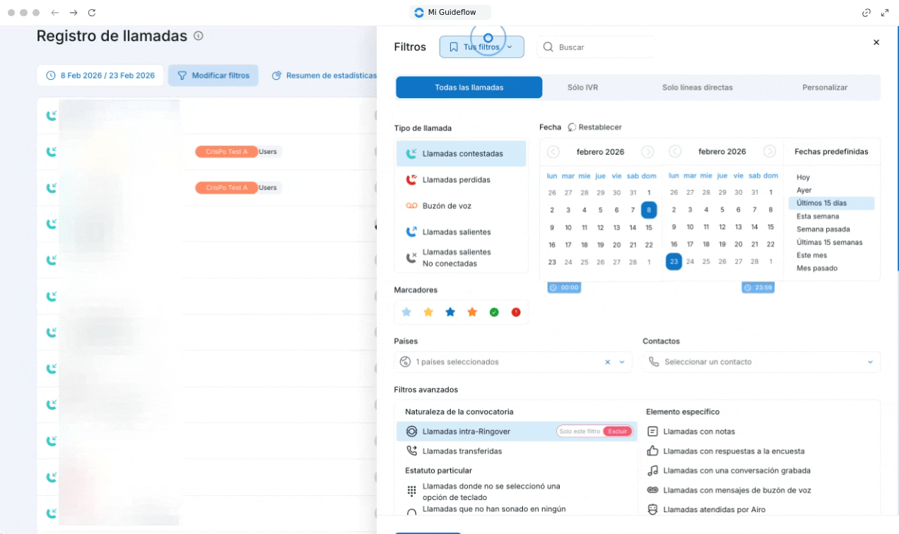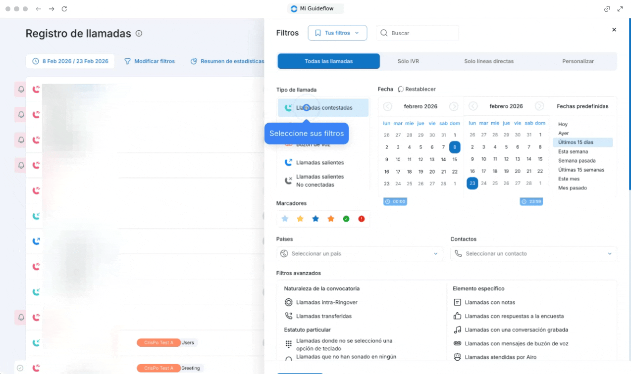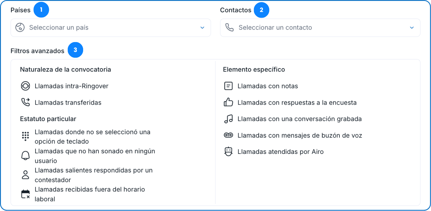 - Los filtros avanzados, que incluyen la naturaleza de la llamada, estados específicos o elementos particulares