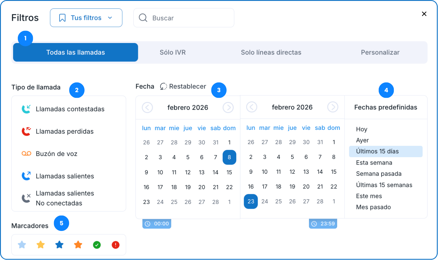 - El tipo de llamada: contestadas, perdidas, mensajes de voz, salientes o salientes no completadas