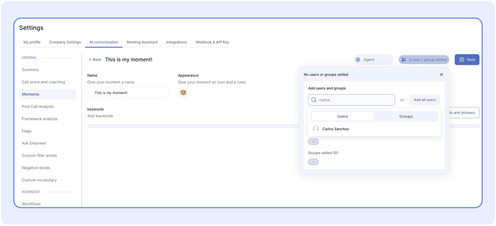 Esta guía describe los pasos para crear y gestionar Momentos (etiquetas automáticas) en Empower, asignarlos a usuarios y utilizarlos en los flujos de trabajo de las llamadas.