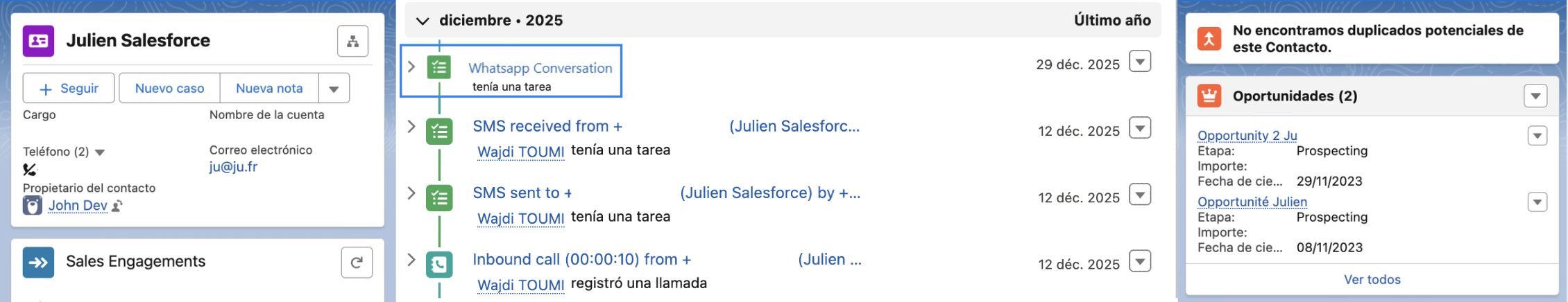 Los registros de WhatsApp también son visibles en el feed de actividades, accesible desde el marcadore integrado.
