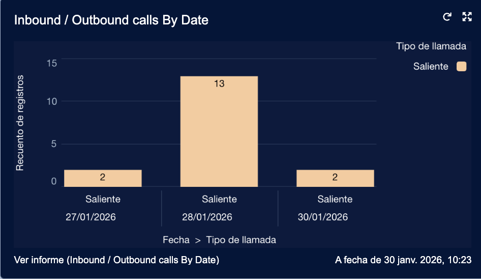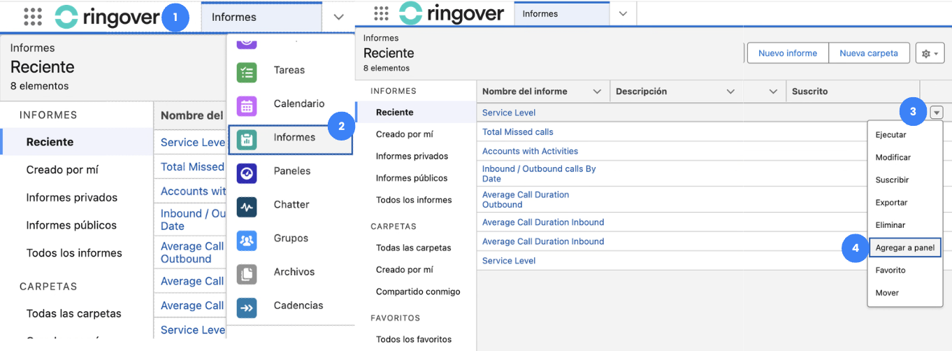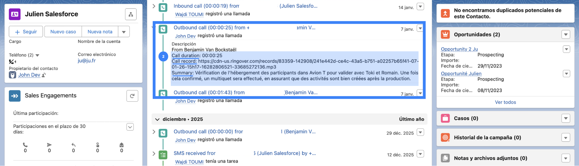 Salesforce ofrece una pestaña dedicada "Ringover" para consultar las estadísticas de llamadas.