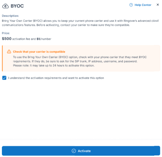 - Haz clic en la opción "Bring Your Own Carrier (BYOC)"