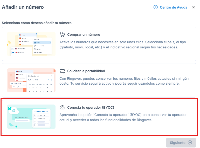 Bring Your Own Carrier (BYOC) te permite conservar tu operador telefónico actual y usarlo con las funciones avanzadas de comunicación en la nube de Ringover. Antes de activar la funcionalidad, contacta a tu operador para verificar la compatibilidad.