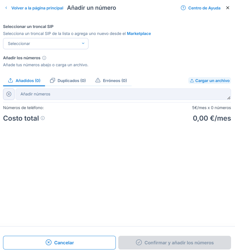 Cada número añadido afectará el costo total. Una vez que hayas ingresado todos los números deseados, haz clic en "Confirmar y añadir los números".
