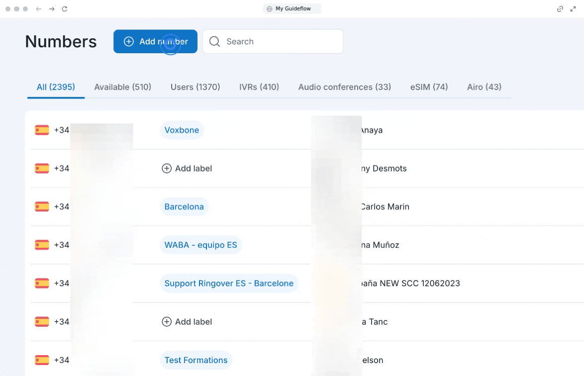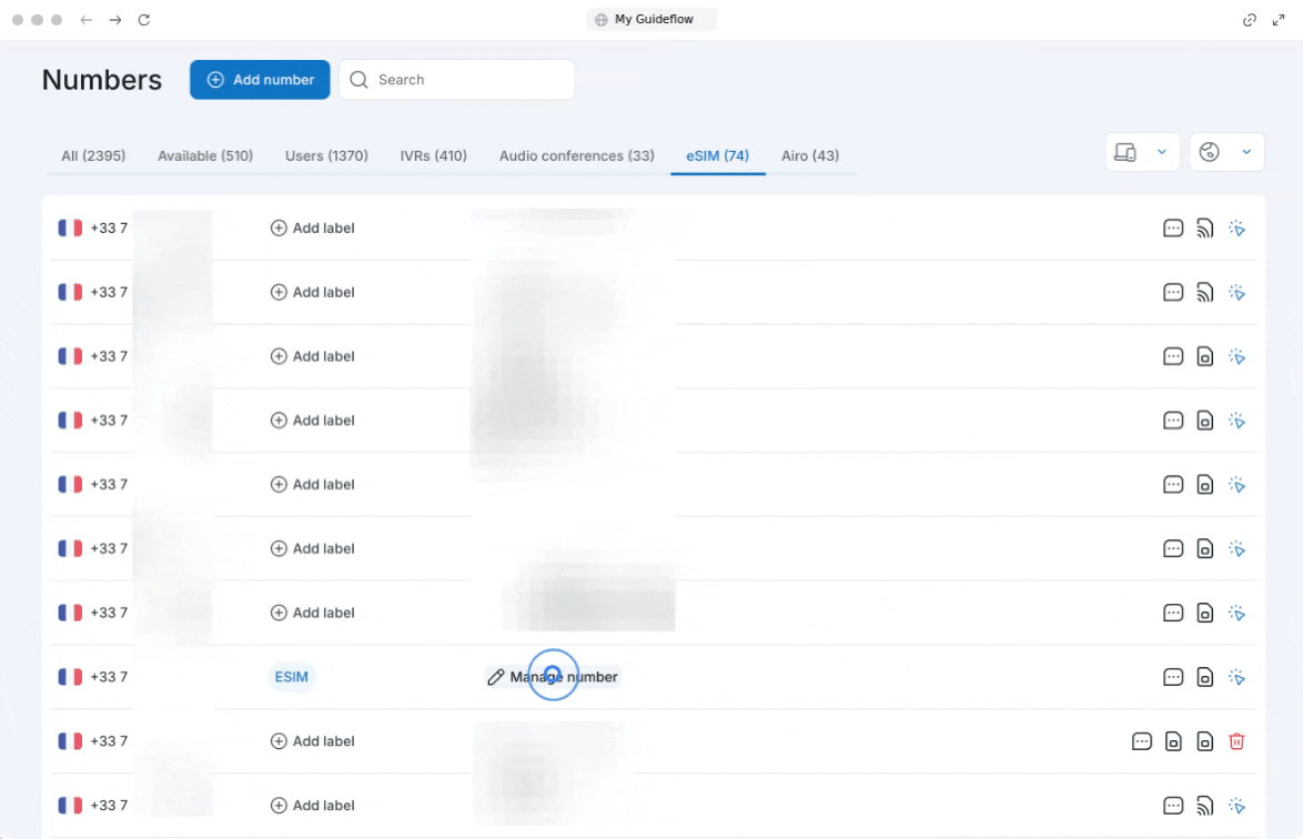 - Filtrar por tipo de número (número virtual, fax, eSIM, pendiente) y por país