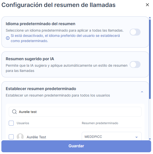 Al activar esta función, la IA analizará automáticamente cada llamada y sugerirá el estilo de resumen más adecuado. Esto permite obtener resúmenes más relevantes sin intervención manual.