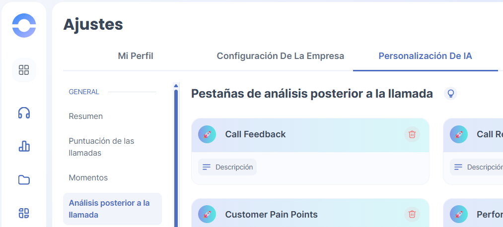 - En Personalización IA, selecciona Análisis post-llamada en el menú lateral.