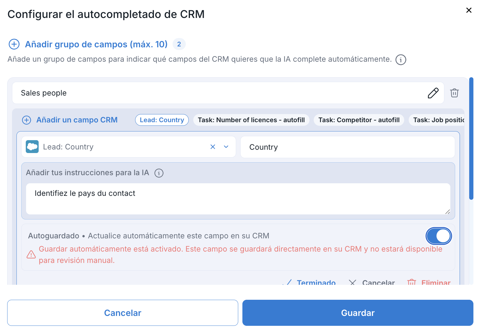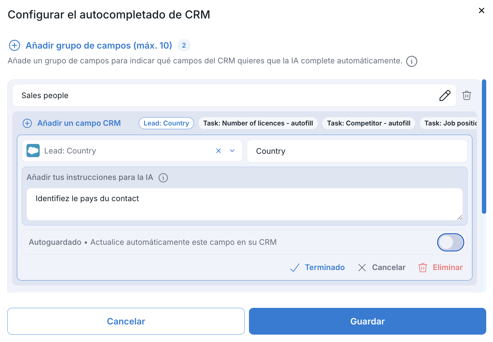 Más adelante, puedes crear otro grupo de campos para tu equipo de Soporte, con diferentes ajustes de autocompletado que apunten a otro conjunto de campos del CRM y utilicen indicaciones (prompts) distintas para extraer información relevante.