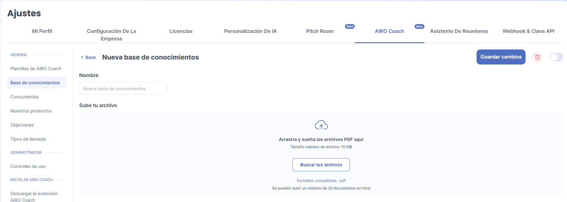 La función Base de conocimientos de AIRO Coach te permite enriquecer la IA con tus propios documentos para mejorar la precisión de los análisis y la relevancia de las sugerencias. Al importar tus recursos internos, la IA dispone de un marco de referencia adaptado a tu empresa.