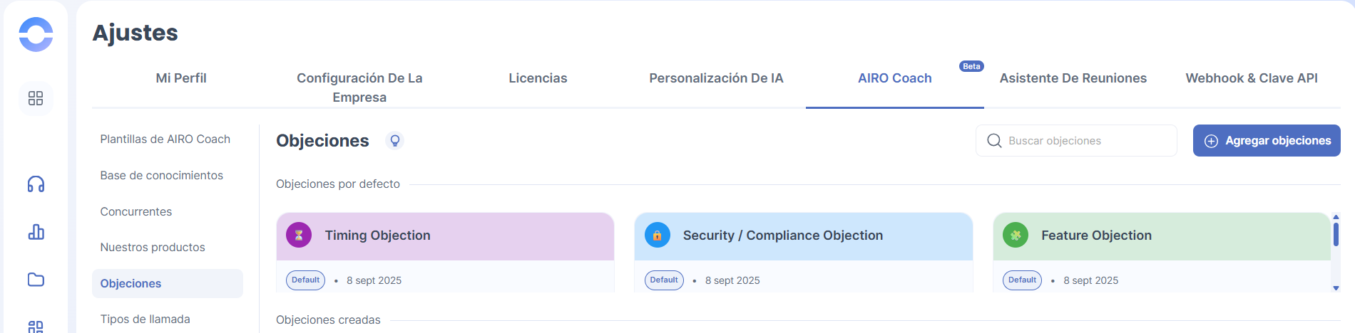 La sección Objeciones de AIRO Coach te permite registrar, categorizar y analizar las objeciones más comunes que encuentran tus equipos durante las llamadas. Al centralizar esta información, facilitas la preparación de los comerciales y la mejora continua de sus argumentos.